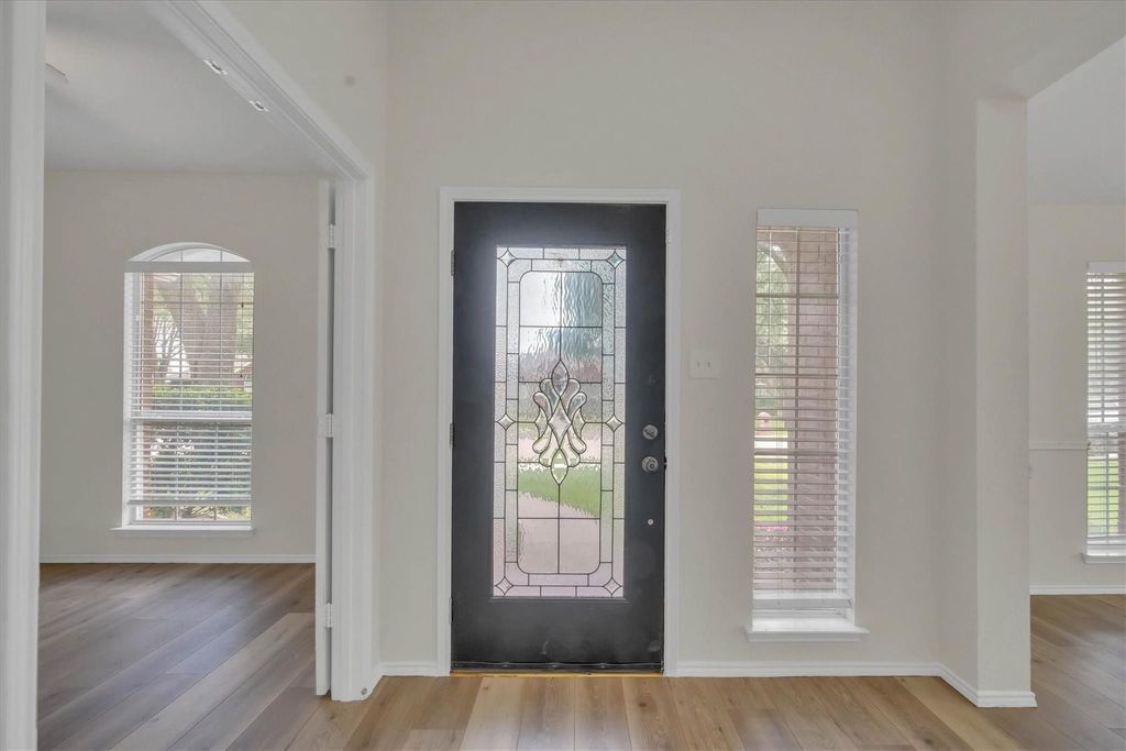 Exceptional curb appeal and arguably the best drive up on the street welcome you to this beautifully updated, move in ready home! Featuring a desirable three way split open floor plan, this residence offers both functionality and style with extensive recent upgrades, including interior and exterior paint, luxury vinyl plank flooring throughout, granite countertops, updated kitchen appliances, AC, water heater, and an expansive covered patio. The spacious primary suite is a true retreat, complete with a large soaking tub, separate shower, dual vanities, and an oversized walk in closet. The fourth bedroom, featuring elegant double entry doors near the front foyer, offers the flexibility of a private study, home office, or guest room. Additional highlights include an oversized garage with built-in shelving and pegboard that convey, plus an impressive 8-foot board-on-board wood fence with steel posts for added privacy and durability. Step outside and enjoy the incredible 27 foot covered patio with ceiling fans; perfect for entertaining, relaxing, or year-round outdoor living. The backyard also features a charming tree house sure to delight the kids and create lasting memories. This home combines thoughtful updates, inviting indoor outdoor living, and standout curb appeal; an exceptional opportunity you won’t want to miss!