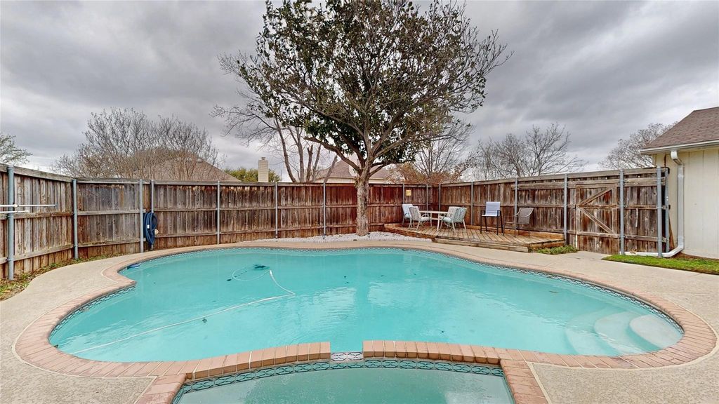 Terrific investment opportunity in the heart of Lewisville! Excellent location just across the street from Southridge Elementary! Inside you will find 3 bedrooms, 2 full baths, formal dining area that makes an ideal second living space or home office, 2-car garage, and pool! Huge family room offers a cozy brick fireplace, vaulted ceilings and wet bar. Kitchen boasts generous cabinet space, granite countertops with a tumbled stone backsplash, stainless appliances including an electric range, and spacious breakfast area with additional breakfast bar seating. Two secondary bedrooms share a full hall bath. Primary bedroom offers a private ensuite bath with dual sinks and two walk-in closets and updated shower with sliding glass door. Private backyard is perfect for entertaining with mature trees, expansive patio, and sparkling pool and spa! All new windows in 2017, heater replaced in HVAC in 2024, and new pool filter 2024!