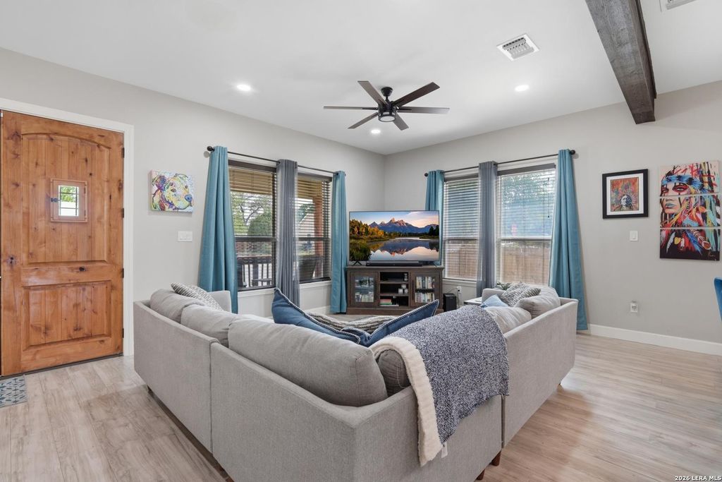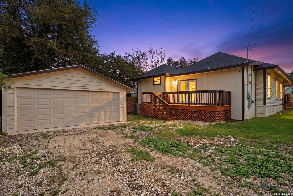 On a corner lot with no HOA, this home makes a strong first impression with a large front porch and striking double front doors that set the tone for its thoughtful design and curb appeal. Inside, the layout features an open floor plan enhanced by high ceilings, exposed wooden beams, and recessed lighting, creating a bright and inviting main living space. The kitchen stands out with dark wood cabinetry, quartz countertops, stainless steel appliances, and a stone island offering additional storage and a convenient breakfast bar, combining both style and function. The primary suite features modern sliding barn doors that add a contemporary touch while maintaining privacy and a clean design feel. Outdoor living is extended with a wooden deck that provides additional usable space, while a detached two-car garage adds practicality and extra storage options. Conveniently located with a short commute to downtown San Antonio, San Antonio International Airport, Fort Sam Houston, and Lackland, t