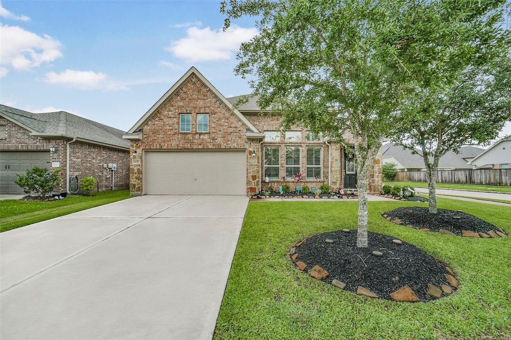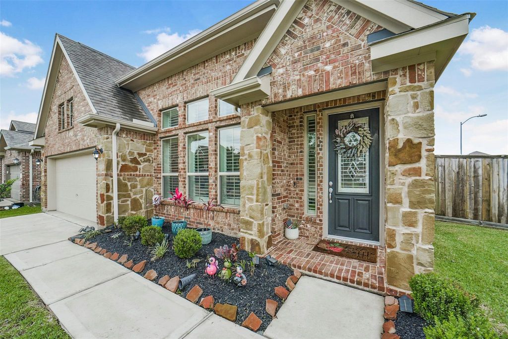 Beautifully maintained one-story brick home with stone accents offers comfort & style. Situated on an oversized corner lot, the property is conveniently located close to schools and shopping. Step inside the spacious foyer to find a flexible bonus area that can easily serve as a formal dining, home office or playroom. The open concept floor plan connects the kitchen, breakfast & family room, creating an inviting space for entertaining or everyday living. The kitchen is a standout with SS appliances, a gas cooktop, large breakfast bar with ample seating. It flows into the family room where a cozy gas log fireplace serves as the focal point. These rooms feature custom shutters. The generously sized primary suite offers a private retreat complete with luxurious bath featuring double sinks, soaking tub, separate shower & walk in closet. Two additional bedrooms share a second bath. A covered patio invites outdoor living w/sprinkler system. Amenities include clubhouse, pool, walking trails.