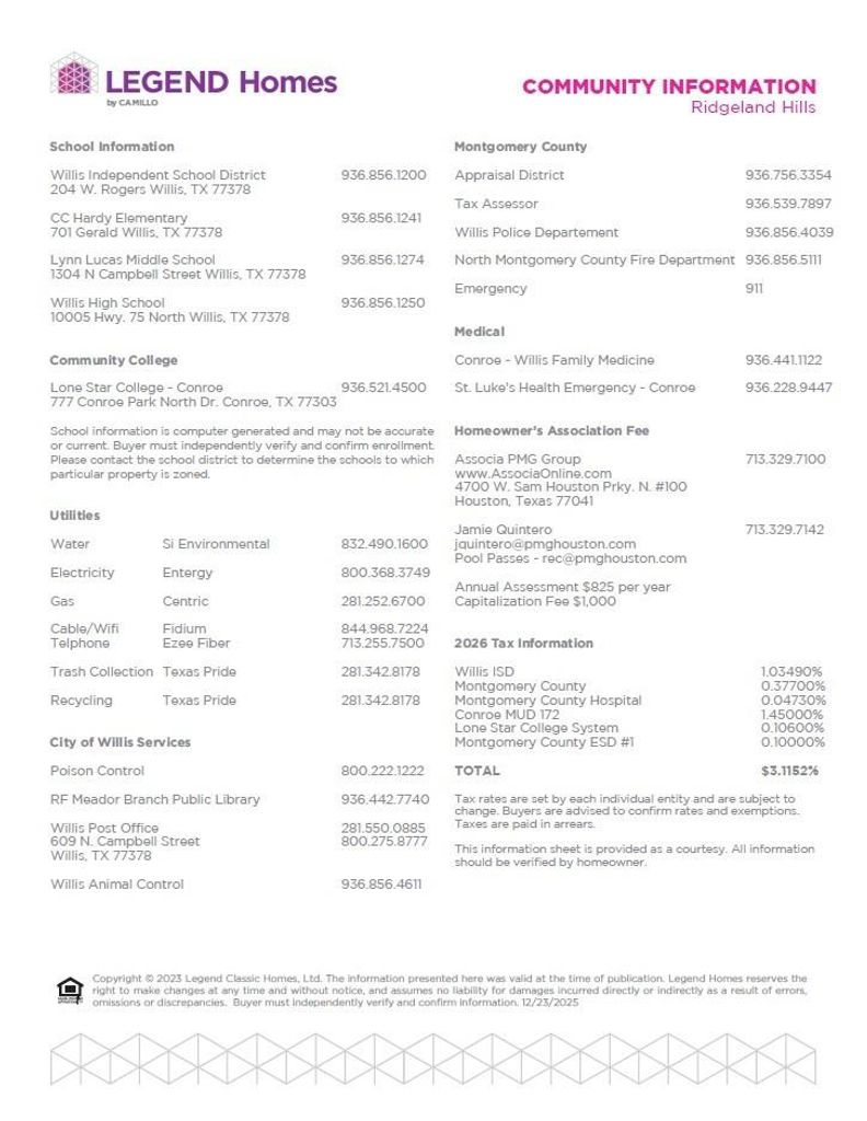 Love where you live in Ridgeland Hills, in Willis, TX! Ridgeland Hills is conveniently located off of I-45 and features a stunning pavilion, resort style pool, large community playground, and a boardwalk along the water for fishing! Now featuring Legend’s NEW Smart Home package and Signature Design Collection! The Wildflower floor plan is a charming 1-story home with 4 bedrooms, 2 bathrooms, and a 2-car garage. This home has it all, including privacy blinds and vinyl plank flooring throughout the common areas! The gourmet kitchen is open to both the dining and family rooms and features 42" cabinets, silestone countertops, and stainless-steel appliances! Retreat to the Owner's Suite featuring a beautiful bay window, double sinks with silestone countertops, a separate tub and shower, and a walk-in closet. Enjoy the great outdoors with a covered patio! Don't miss your opportunity to call Ridgeland Hills home, schedule a visit today!