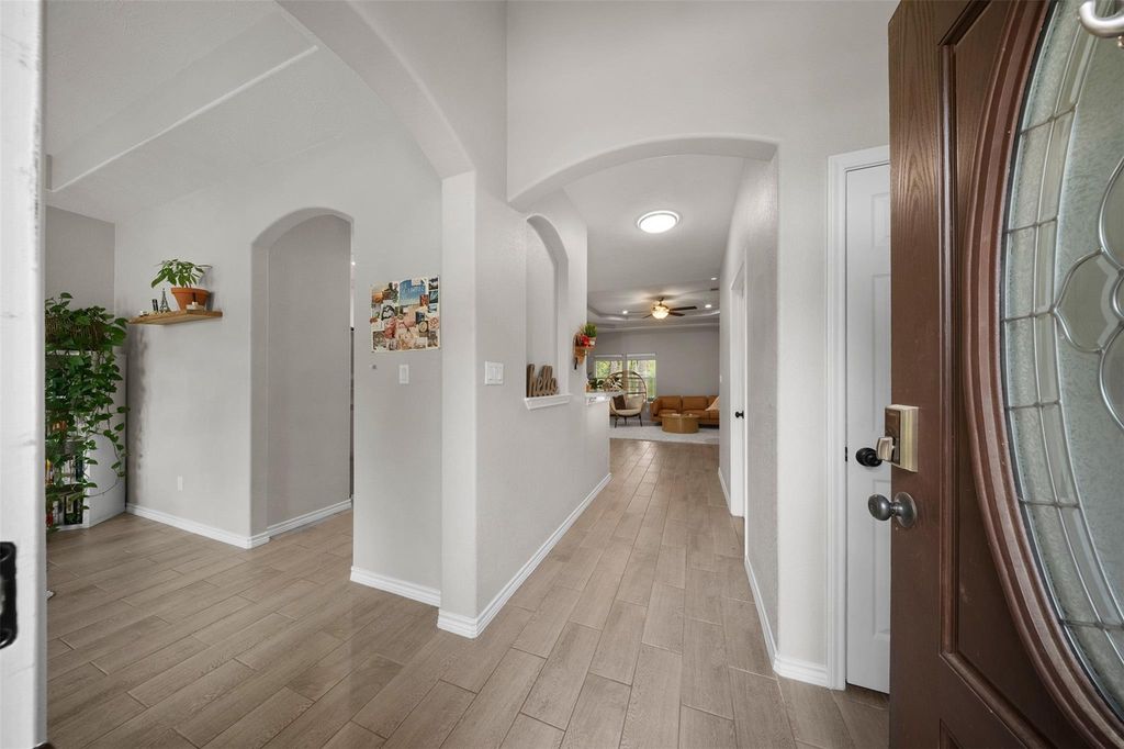 Beautifully designed one-story home on an oversized lot in Texas National! This 3-bedroom, 2-bath residence showcases high ceilings, tile flooring, and an open-concept layout filled with natural light. The kitchen features a breakfast bar, walk-in pantry, and flows seamlessly into the living and dining spaces—ideal for entertaining. The private primary suite offers a spa-like bath with soaking tub, separate shower, and walk-in closet. Enjoy outdoor living on the covered patio overlooking a spacious backyard. Energy-efficient upgrades and quality finishes throughout make this home stand out.