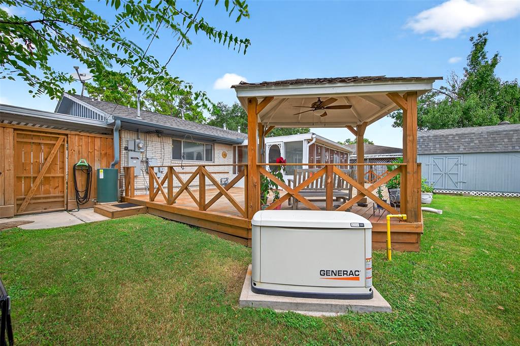 Charming home in a neighborhood with spacious bedrooms, including one with two closets. Features laminate floors, tile in main areas, and a living room with high ceilings, a beam, and wiring for surround sound. Comes with window treatments, washer/dryer connections, and a beautiful vintage style stove. Many updates throughout, including roof, A/C, furnace, appliances, generator, and more. Enjoy a covered patio, large deck, tall privacy fence, storage shed, and an extra covered parking area. Close to Cole Creek Park, shopping, dining, and major highways.