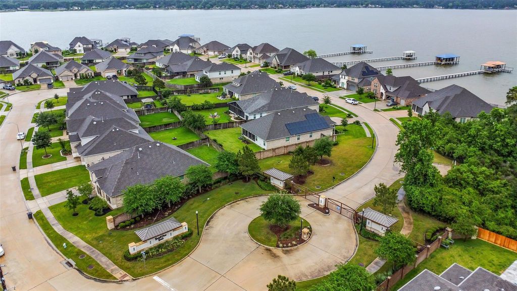 Nestled on a quiet cul-de-sac in a gated waterfront community on Lake Houston, this stunning two story offers the perfect blend of space & privacy. Thoughtfully designed with open-concept living, 5 bedrooms (2 downstairs), 3 full baths, & a large upstairs gameroom. The kitchen is well-appointed with 42” cabinetry, modern hardware, under-cabinet lighting, stainless steel appliances, an upgraded sink & faucet, & a walk-in pantry, all opening seamlessly to the impressive family room with soaring ceilings, abundant natural light, & a custom electric fireplace feature wall. Enjoy a spacious backyard with no direct neighbors behind or on one side, a covered patio with magnetic screen for year-round use, & wrought iron fencing on the side yard that provides lake views. The community features a lakefront resort-style pool, clubhouse, & playground. Ideally located near Will Clayton Pkwy & West Lake Houston Pkwy with easy access to 59 & Beltway 8, offering both convenience and tranquility.
