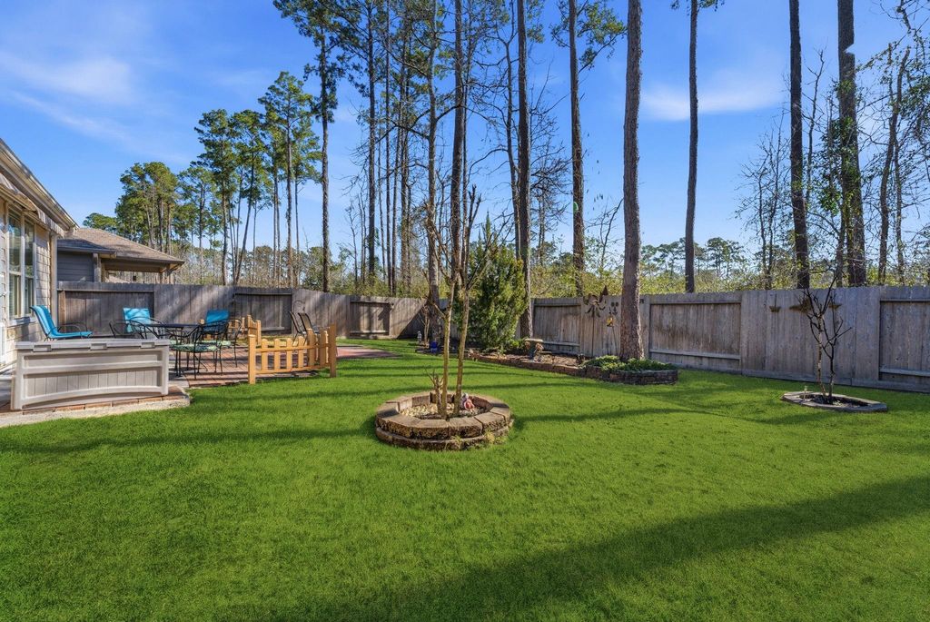 Charming Updated Home in Serene Woods of Conroe – No Backyard Neighbors, minutes from outdoor recreation at Lake Conroe & convenient access to TX-105. Assumable 2.25% interest rate. Inside, enjoy an open floor plan w/ abundant natural light & thoughtful upgrades including granite counters, wood flooring, custom cabinets & closets, 50-gal water heater, + a garage outfitted w/ shelves & workbench for excellent storage & organization. Recent enhancements also feature whole-home gutters, fresh landscaping, & an expanded brick patio — perfect for outdoor living. Step into your private backyard sanctuary w/ no rear neighbors, ideal for tranquil evenings & entertaining. The Woods of Conroe offers a family-friendly, nature-rich setting w/ green space, wooded streetscapes, & easy access to local schools & community amenities. This home combines comfort, style, & location for an exceptional value.