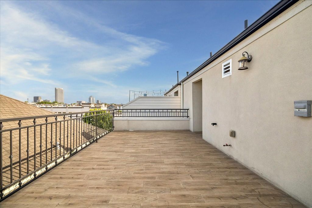 Sophisticated, timeless, four-story modern residence in the heart of Rice Military and the Washington Corridor, offering a private driveway, refined architectural lines, and light filled interiors. The open second floor impresses with 2 sets of three panel doors opening to the balcony. Soaring ceilings, wide-plank hardwoods throughout and an elegant quartz island kitchen appointed with Bosch appliances and custom cabinetry. The serene primary suite features a spa-inspired bath with soaking tub, oversized shower, and a beautifully designed closet. Secondary bedrooms each enjoy en-suite baths for elevated privacy. The crown jewel is the expansive 4th-floor rooftop patio showcasing sweeping downtown views—an exceptional setting for entertaining or unwinding. Ideally located minutes from Memorial Park, Buffalo Bayou trails, and premier dining and lifestyle destinations.