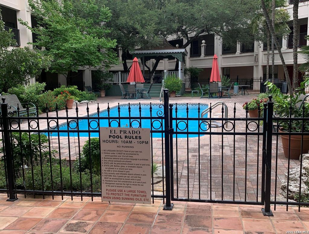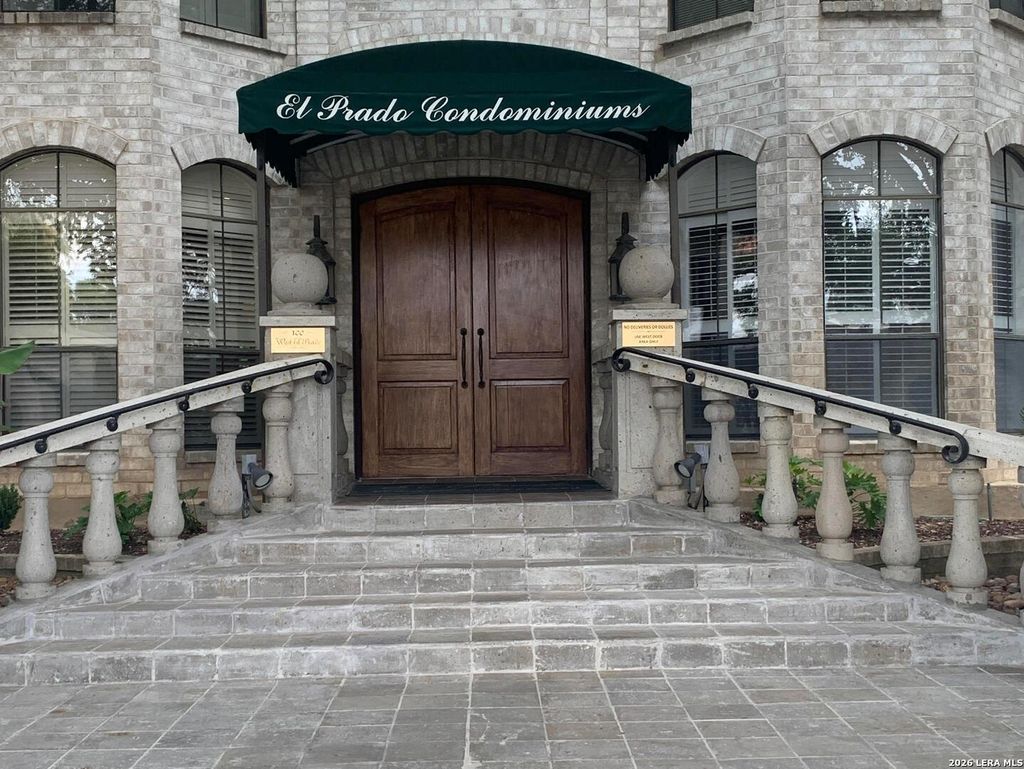 Beautiful 2 bedroom 2 bath condominium at prestigious 100 El Prado in the heart of Olmos Park. Unit just painted, new window coverings, granite counter top in kitchen, stainless steel appliances. No carpet, VLT flooring and ceramic tile, no carpet. Secured front door entrance, gated under ground parking with 2 spots and remote clicker. Beautiful pool, gazebo and outdoor grill available. Close to downtown, 281, 410 and IH-10. Must see!