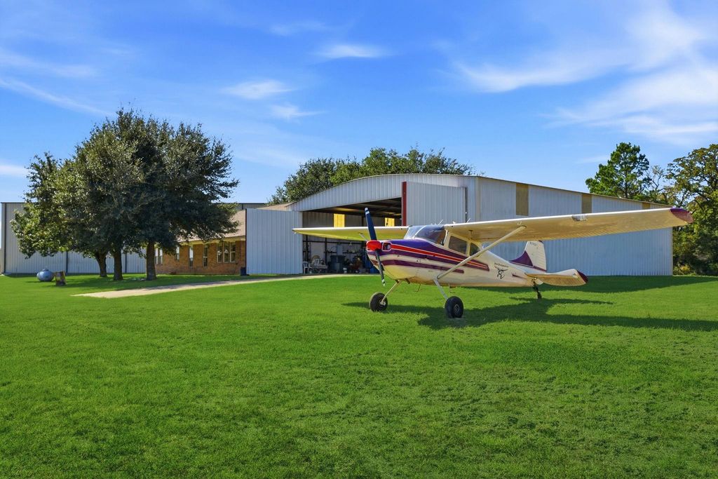 Where are the Pilot's? Brick Home on the runway, 4 Bedrooms, 2 Full baths, 2654 Sq Ft, with a 50 ft wide x 60 ft deep Metal lighted Hangar with a workshop. Pull your plane out and you are looking at the runway! Property has 4 lots with mature trees in the front and rear. This one story home works well for the less mobile - no second floor. Water heater replaced approx 4 years ago. Formal dining, Formal Living, Family Room are perfect for entertaining family and friends. The Asphalt Runway 17/35 is 3018 ft long. Identifier: 0TE4 Mingle at the Pilot Lounge or join the T-38 club. This well known community boasts Resort Style living with an 18 hole Golf Course, 5 Excellent Fishing Lakes, Tennis Courts, Texas-sized & Texas-shaped Swimming Pool, Equestrian Facilities, Campground & much more. Hilltop Lakes is in the heart of the Texas Triangle, almost equal distance from Houston, Dallas & San Antonio & only roughly 50 minutes from Texas A & M University