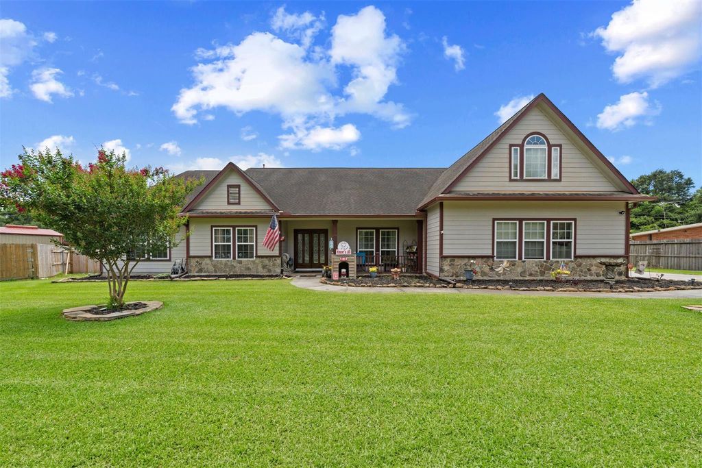 Incredible & spacious single-story home on a 0.48 acre cul-de-sac lot with a shaded front porch, ample driveway space, & no back neighbor for added privacy! Inside, you'll find high ceilings, all solid flooring, crown molding, ceiling fans throughout, bay windows, a formal dining, French door study, living room with a fireplace, oversized utility room, breakfast area, & kitchen with a cooktop island, granite, breakfast bar, under cabinet lighting, lots of storage space, & a walk-in pantry. The large primary suite includes a walk-in closet, dual vanities, soaking tub, & separate shower while the back of the home offers a detached garage converted to a bonus room with a window unit - perfect as a guest room, game room, workshop, home gym, etc! Enjoy outdoor entertaining with an enclosed covered patio, huge wood deck, & plenty of fenced backyard space! Easy access to TX-99, TX-146, TX-330, & Roseland Park which offers boat ramps, sports courts, a playground, picnic area, & more! NO HOA!