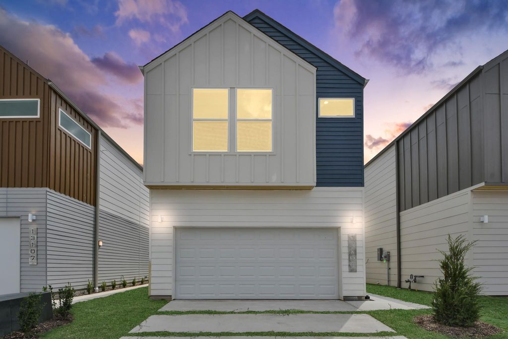 Welcome to Alicante, a private gated enclave located just outside the city's bustling inner loop. This community boasts a sophisticated open-concept design featuring two living spaces: a welcoming first-floor living room and a versatile second-floor flex space. The home is well-appointed with three bedrooms, 2.5 baths, and a luxurious primary suite complete stand-up shower. High ceilings and abundant natural light enhance the elegant interior, complemented by quartz countertops, under-cabinet lighting, and sleek European-style cabinets in the kitchen. The large island provides ample space for cooking and gathering. Step outside to enjoy tranquil waterfront sounds on the walking trail or simply unwind in your serene outdoor space. Experience the perfect blend of comfort and modern luxury at Alicante. Visit our model home 3209 La Latina Dr, Houston, TX 77047