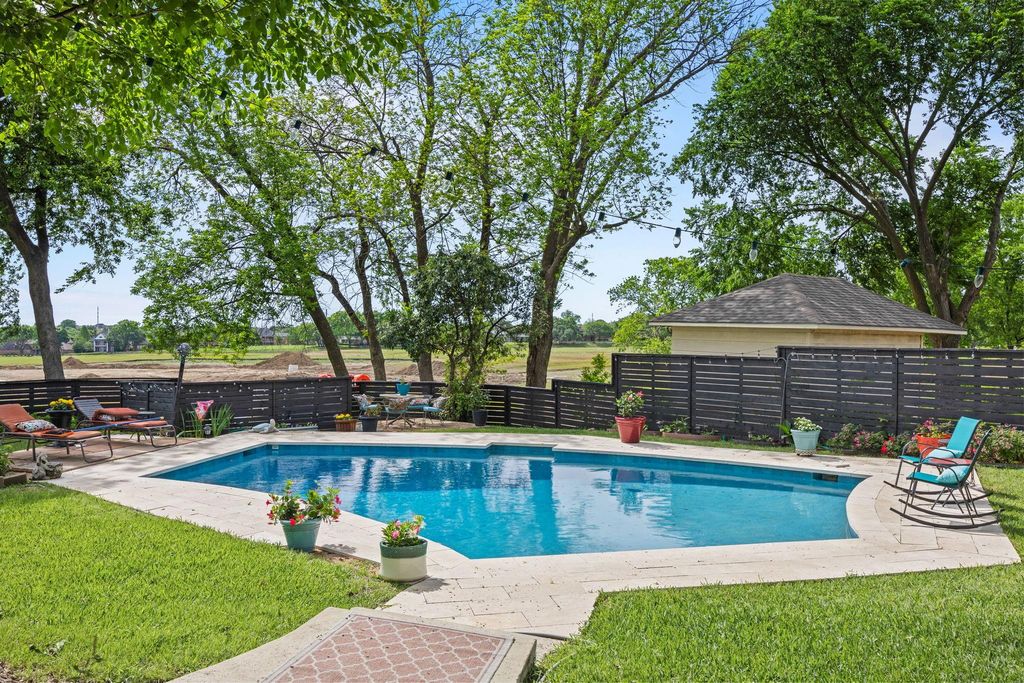 Tucked on over half as acre, this 5-BR, 3.5-bath home blends timeless charm and thoughtful updates with a unique floorplan featuring 2 primary suites. Mature trees and expansive lawns welcome you, while special touches, like cozy window seats, add warmth and character throughout. Both primary are located on the first floor. The front suite includes an adjoining bedroom currently used as a nursery, but perfect as a private sitting room, office, craft, or fitness space. A second, generously sized primary suite is tucked at the rear with its own ensuite bath. Open living, dining and breakfast areas are designed for everyday comfort and easy entertaining. The living room showcases built-in shelving and a beautiful stone fireplace, while the spacious dining room is lined with windows overlooking the lush front yard. The updated kitchen shines with abundant white cabinetry, quartz counters, gas cooktop, farmhouse sink, and pantry, seamlessly connecting to the dining and breakfast areas. A stylish half bath completes the main level. Upstairs, two additional bedrooms include an oversized retreat with THREE walk-in closets and ensuite access to a full bath that also opens to the hallway. A walk-in attic room provides excellent storage. Step outside to your own backyard oasis with a private patio, sparkling pool, large grassy yard, play structure, and storage shed. There’s plenty of space here to relax or entertain! Ideally located near Lake Ray Hubbard, and less than 5 minutes elementary and high schools, this home is also close to parks, shopping and dining.