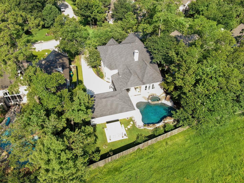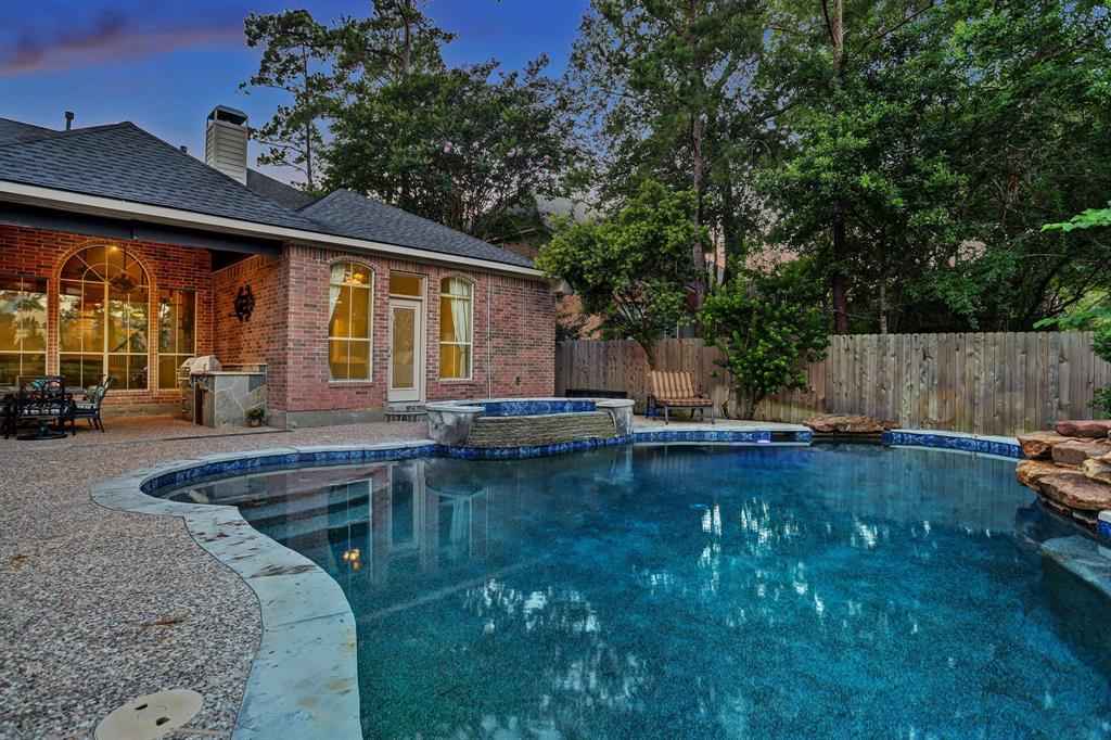 Stunning, second owner home situated on a 10,000 sq ft lot; no rear neighbor, zoned to highly rated Conroe independent school district. Updates: Viking Professional SS kitchen appliances+reverse osmosis water system+whole house water softener system+covered patio & outdoor kitchen w/fridge, gas grill & cooktop, & mounted tv that stays+2015 roof+2018 water heaters (2)+2015 ac unit (1)+custom, in-ground salt water system pool w/hot tub+2014/2015 (4) full bthrms remodeled w/modern finishes. The spacious master bdrm has been remodeled w/a custom door frame leading to your private backyard oasis, & Elfa master closet system. Crown molding & built-ins provide the ultimate character to this well appointed home. Great size bedrooms w/ample closet space; (2) bedrooms share Jack & Jill bathroom. The family room is complete w/high ceilings, pool/hot tub view, & soaring ceilings. The 3 car garage has built-ins and storage system stays.