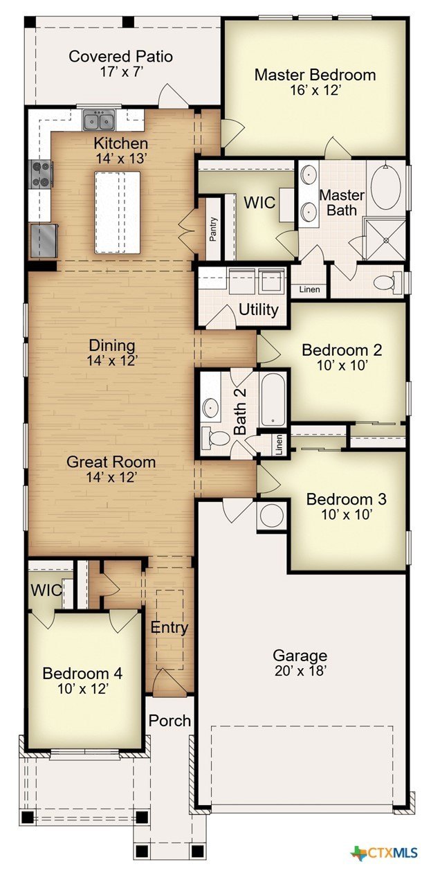 The Montgomery offers a four-bedroom, two-bath layout across 1,700 square feet with an open-concept family room, dining area, and kitchen. The secondary bath provides convenient access with two entry points from either the bedroom hallway or the main living area. The kitchen includes stainless steel appliances and a large island that adds extra seating, counter space, and cabinet storage. The primary suite features dual vanity sinks, its own enclosed toilet space, and a walk-in closet. Plan variations include a shower-only option or a shower-and-tub combo in the primary bath, sliding pocket doors at the toilet space, and a study in place of the fourth bedroom. This plan also includes a two-car garage.