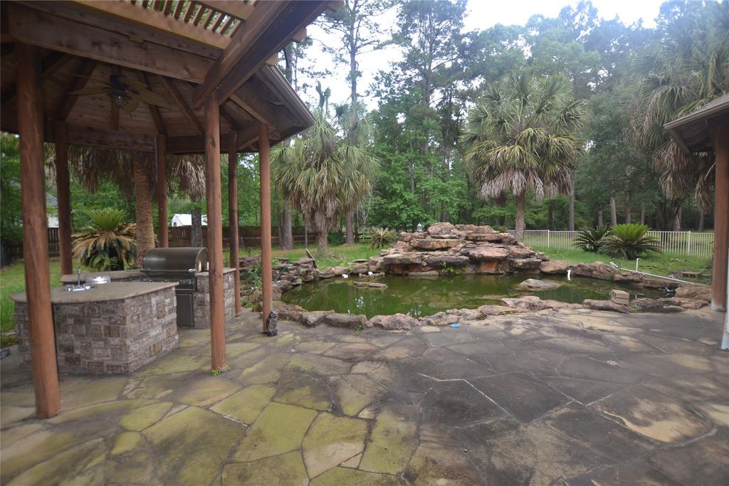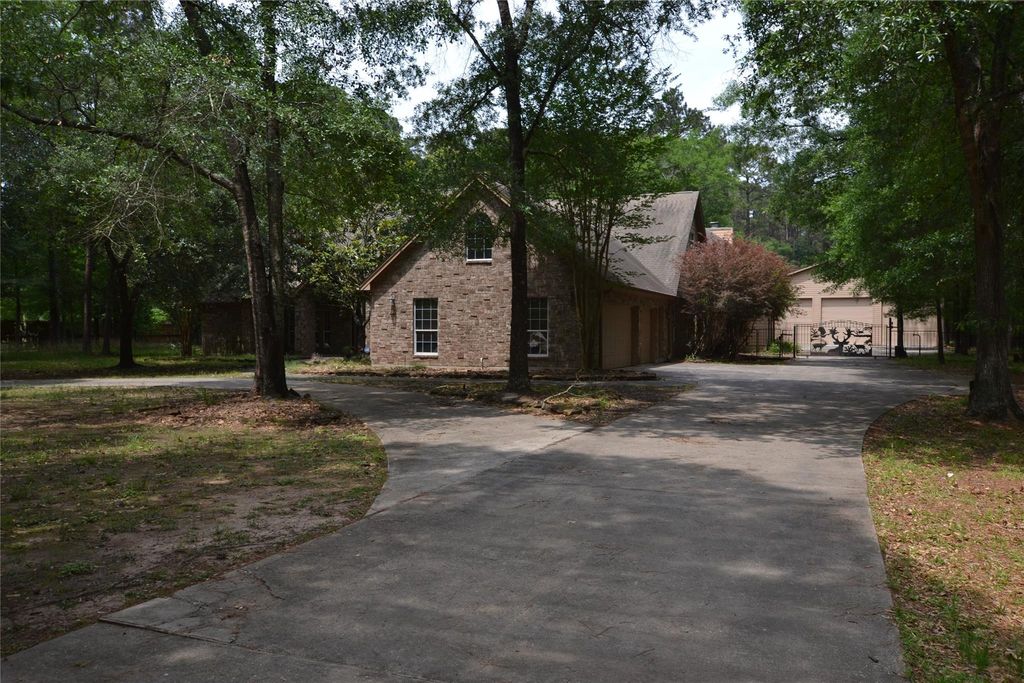 Escape to the country with this stunning custom 1.5 story ranch-style home nestled on 3+- beautiful acres. The property features a huge 50x60 workshop, perfect for hobbies or storage. Inside, you'll find an enormous den with cedar and knotty pine wood walls, a beautiful rock fireplace, and a 103' flat-screen TV that remains in the home. The dream kitchen boasts a Sub Zero refrigerator and freezer, an undermounted refrigerated veggie drawer, a five-burner gas stove, and a trash compactor. Outdoor living is exceptional with a pavilion, a pool-sized koi pond, and an outdoor fireplace, ideal for entertaining. The large metal building includes four 14' roll-up doors and a drive-thru circular driveway for easy access. The home is on a water well and septic system, zoned to sought-after Magnolia ISD, and offers a very low tax rate. Perfect for those seeking tranquility, space, and modern comforts!