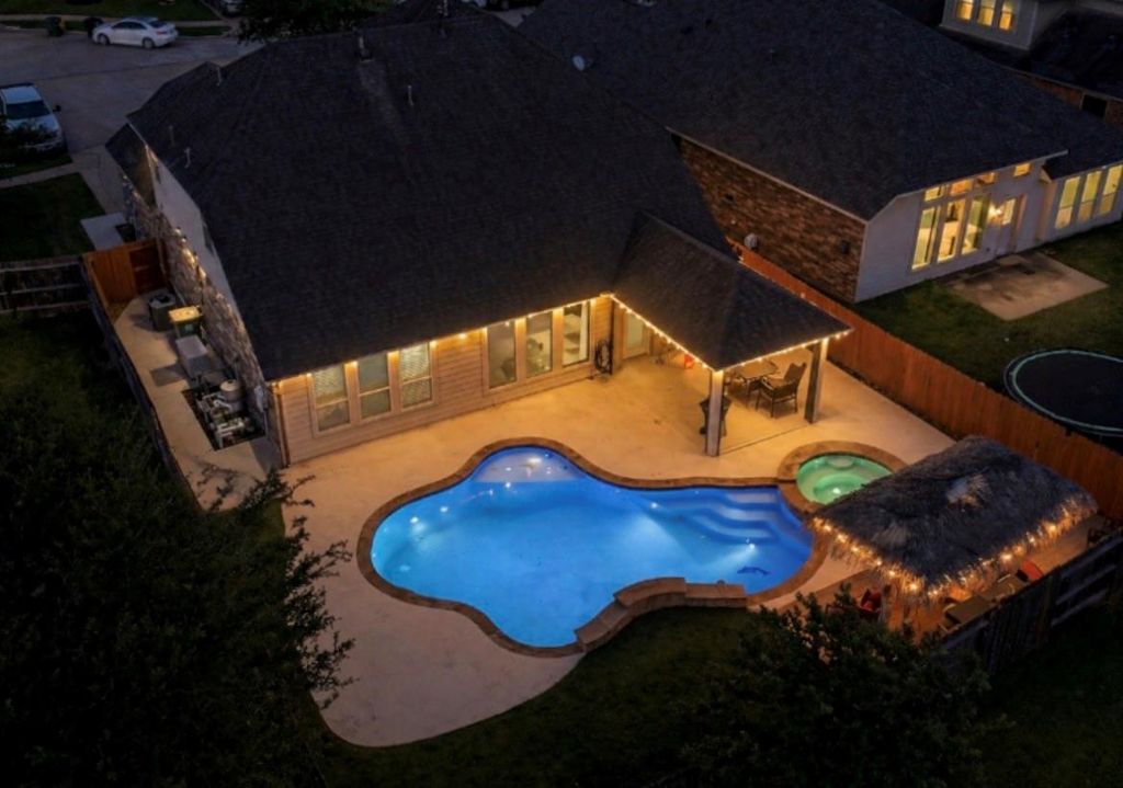 Beautifully updated with bold designer touches and elevated finishes throughout with a warm yet sophisticated feel. Fresh interior paint throughout highlights the crown molding, spacious layout, and seamless flow between living spaces. The living room opens into the fully remodeled kitchen featuring a large island, custom cabinetry, updated flooring, with modern finishes. The large windows bring in natural light while creating inviting views of the backyard retreat. Step outside to a serene pool pr hot tub area designed for privacy and relaxation, surrounded by mature landscaping and peaceful outdoor living space is perfect for entertaining or a quiet evening at home. A built-in Generac generator adds safety for your family, valuable peace of mind, and dependable backup power during storms and outages. Convenient access to Beltway 8, I-45, Pearland Parkway, and nearby shopping including H-E-B adds everyday functionality. See full list of updates and improvements in HAR attachments.