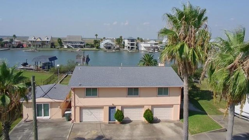 Waterfront retreat on Crash Boat Basin — Rare 100’ x 222’ lot (22,000 sq. ft.), significantly wider than the traditional 75’ lots in the area. A circular driveway and mature oak welcome. 3-bedroom, 2-bath residence with modern windows, PEX plumbing, and high-efficiency 18 SEER A/C. Enjoy West Bay sunsets from the upper viewing deck, screened porch, or expansive outdoor spaces. The boathouse is well-positioned off the property line, offering a sheltered waterfront ideal for keeping a sport fishing boat or similar vessel right in your backyard. Inside, the home blends comfort with functionality, while outside, a 3-car garage provides ample storage and hangout space. A separate 16’ x 25’ structure offers flexibility as an art studio, craft space, or potential guest quarters. Neighborhood amenities nearby include Moody Gardens Golf Course, the shops and dining at Evia (Sugarbean Coffee, Palmetto, Empouria), boutiques, and weekly community events. Waterfront living with in-town convenience.