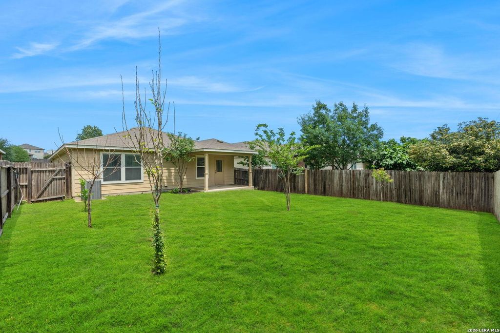 Welcome to this charming single-story home nestled in one of San Antonio's most desirable neighborhoods. Located within the top-rated Johnson High School district and walking distance to Cibolo Green Elementary, this property offers an exceptional setting for families seeking quality education and convenience. Inside, three bedrooms and two bathrooms feature newly installed luxury vinyl flooring throughout - no carpet. The spacious open floor plan flows seamlessly into a large eat-in kitchen complete with ceramic tile backsplash, recessed lighting, and stainless steel appliances. A thoughtful split layout provides welcome privacy between the primary bedroom and secondary bedrooms, while trey ceilings add an elegant touch. Step outside to a covered patio and private backyard backing up to the prestigious Gran Palacios neighborhood of Cibolo Canyons. With a three-year-old roof, newer water heater, and full sprinkler system, major maintenance concerns are already addressed and provides p