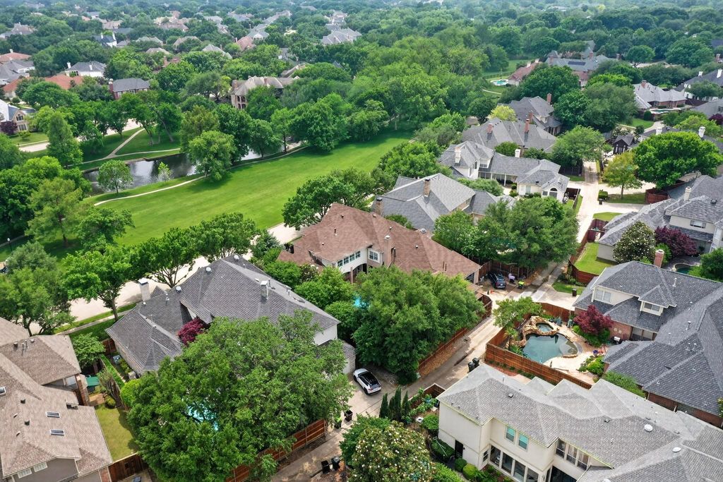 Nestled within the prestigious enclave of Lakeside on Preston, this 5,998-square-foot estate offers more than just a residence—it offers a lifestyle defined by elegance and natural beauty. Positioned on a premier lot with tranquil lake and park views, the home commands attention with its stately curb appeal. A deep, covered front veranda and a classic upstairs balcony overlook the tree-lined street, inviting you to enjoy the quiet rhythms of one of Plano’s most coveted neighborhoods. Upon entry, the home reveals its architectural pedigree through a grand staircase, soaring ceilings, and expansive windows that flood the space with light. The heart of the home is a designer kitchen balancing style and high-end function, featuring a six-burner Dacor gas range with double ovens, built-in refrigeration, and a back staircase for discreet access. This space flows into a breakfast nook that opens to a side patio, and a cozy den anchored by a fireplace and walk-in wet bar. For those who work or exercise at home, the property offers a rich wood-paneled study with French doors and a separate bonus room with hardwood flooring and mirrors, ideal for a gym. Upstairs, a massive game room features its own balcony, a second walk-in wet bar with a fridge and dishwasher, and ample space for a pool table. Adjacent is a dedicated media room for a true cinema experience. The primary suite serves as a private sanctuary, featuring a sitting area, a gas fireplace, and bay windows with direct patio access. The ensuite is a masterclass in luxury with dual vanities, a hydrotub, and a rare hidden safe room. Outside, the resort-style oasis has a heated pool and spa and a garden sitting area under mature trees. The covered patio offers a fireplace and built-in grill station to provide the ultimate setting for al fresco dining. With tons of storage, a large floored attic, and access to community lakes, trails, and tennis & pickleball courts, this home is a rare masterpiece of design and comfor