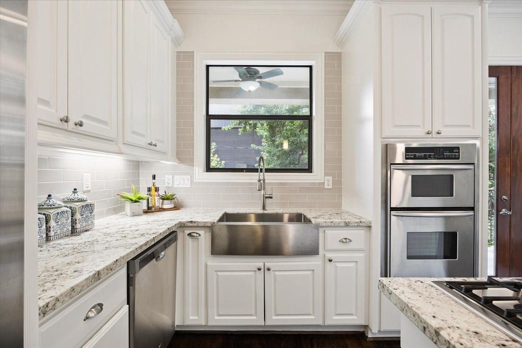 Beautiful townhome just minutes from Memorial Park, Buffalo Bayou Trails, and downtown! Rare large private backyard with patio and charming spiral staircase that provides direct access to the kitchen. New roof in 2024! New sunny eat-in kitchen features granite countertops, a gas cooktop, and a coffee bar. Lots of room for a table and chairs or a sitting area. The private balcony off the kitchen is a great spot for coffee! The formal dining room and living room flow seamlessly together, overlooking the trees with a fireplace and a built-in wine bar. Upstairs, the spacious primary suite boasts a dramatic vaulted ceiling, large windows, and a luxurious en-suite bath with dual vanities, a soaking tub, and a newly tiled walk-in shower. The secondary en-suite bedroom is filled with natural light and a large closet. On the first floor, the en-suite bedroom or home office opens to the yard, has a large closet, and a new, beautiful bathroom with marble-style finishes. This is a must-see!
