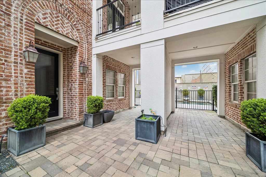 Poolside Elegance in EaDo! Welcome to 1015 Saint Charles St., a beautifully designed home tucked within a charming courtyard with pool views in the vibrant EaDo neighborhood. Classic brownstone-style architecture and paved grounds create a warm arrival. Inside, rich wood floors, crown molding, and custom built-ins with a library ladder add character to the living area, anchored by a cozy fireplace and window seats. The open layout flows to the kitchen and a spacious balcony overlooking the pool—ideal for entertaining. The primary suite features a private balcony, spa-like bath with soaking tub, dual vanities, and two custom closets. All secondary bedrooms offer en-suite baths. Enjoy a serene community pool with fountains and walk to nearby bars, restaurants, and entertainment, including Shell Energy Stadium, Discovery Green and the Toyota Center.