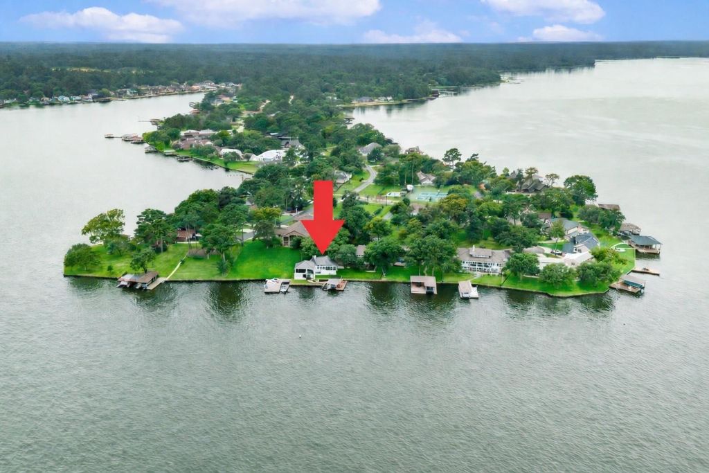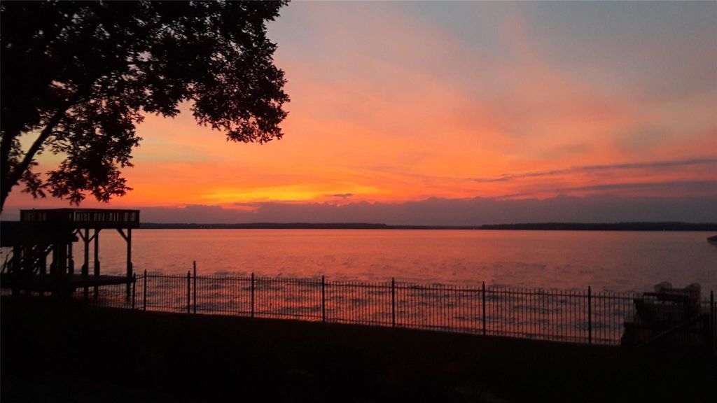 Click Virtual Tour Link Above to see Breathtaking views, where every day feels like a vacation! Beautifully designed, custom home features a dramatic 2-story entry & family room, soaring ceilings & walls of windows that flood the open-concept kitchen, living & dining areas with natural light. Main floor offers 2/3 BRs & 2 full baths, including primary suite with jetted tub & dual closets. Upstairs living quarters: BR, full bath, kitchenette & screened-in balcony overlooking the lake (in-law suite). Storage space over garage: floored & vented for climate control. Entertain with full outdoor kitchen, large covered patio, private dock (4 lifts, enclosed storage) & new 90’ bulkhead. 2.5 car garage designer epoxy floors & workshop. Fully fenced yard with plenty of grass. Just steps from neighborhood pool, grill, swings & courts–nearby community boat ramp. GENERATOR & VACUUM SYSTEM. Some photos digitally staged.
