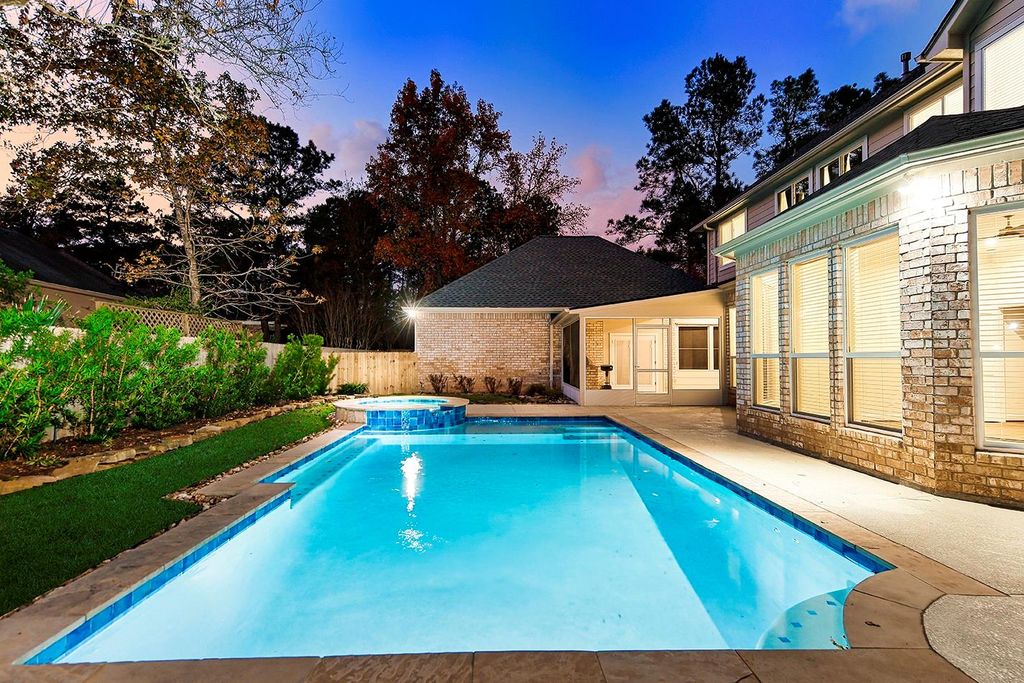Completely remodeled custom home in Cochran's Crossing! Located in the heart of The Woodlands, this home features a brand new roof and gutters, 2 new Trane a/c units, 2 new water heaters, new whole house water softener and filtration system, all new engineered wood floors, new interior doors, designer light fixtures, sky high ceilings, all new soft close cabinetry and drawers, 3 car garage w/epoxy floor + porte-cochere, and much more! Both formals open to one another, with a marble fireplace and coffered ceiling; the study is stunning w/custom built-ins and faces the front of the home. Spectacular open kitchen with Taj Mahal leathered counters, huge island, all new appliances (fridge included), pot filler and warming drawer. Primary bedroom suite down w/customized closet and breathtaking bath; 3 bedrooms with 2 remodeled baths and game room up with beverage fridge. Screened in porch with new summer kitchen overlooks the beautiful pool.