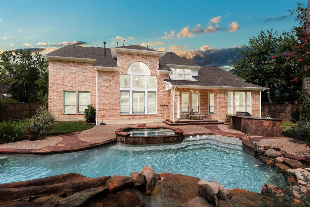 Welcome to a stunning home in one of The Woodlands' most desirable neighborhood. This 5 bedroom, 3.5 bathroom residence greets you with plantation shutters and gleaming hardwood floors that flow seamlessly throughout the main living spaces. Inside discover a dramatic curved staircase beneath soaring ceilings that lead you to the inviting living room that features custom built-ins and gas fireplace. The kitchen offers double ovens, island, under-cabinet lighting, water filtration system and butler's pantry. Retreat to the primary bedroom suite, with a relaxing soaking tub, separate shower, dual sinks, and vanity area. Upstairs, four additional bedrooms feature custom California Closet systems alongside two full bathrooms and a generous game room. The backyard showcases lush landscaping, a heated pool complete with slide and water features, plus a fully equipped outdoor kitchen. Recent upgrades include new roofing and fresh interior and exterior paint.