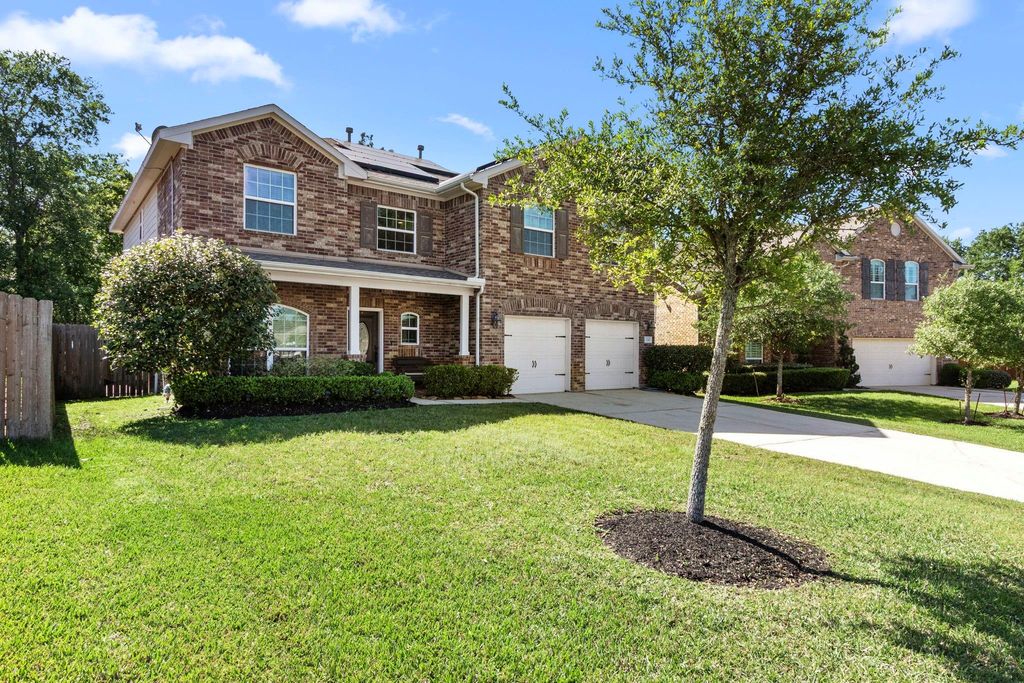 send all offers Well Maintained Home Stunning 5-Bedroom Home in Barton Woods! Nearly 3,000 sq ft of stylish living with a guest room and a flexible office formal dining downstairs, 4 spacious bedrooms upstairs. The open-concept kitchen features granite counters, 42” cabinets, and a breakfast bar that flows into the bright family room. Extra bedroom downstairs (not primary) Upstairs, enjoy a massive game room / Media room and a private primary suite with dual walk-in closets. Step outside to a HUGE backyard with two patios, a fire pit, and no rear neighbors—perfect for sunset views and privacy. Just minutes from I-45 and The Woodlands, this energy-efficient home includes solar panels + a backup battery, cutting summer electricity costs by up to 90%. Home is also an FHA assumable loan. Space, comfort, and sustainability—this home has it  all! Priced to sell