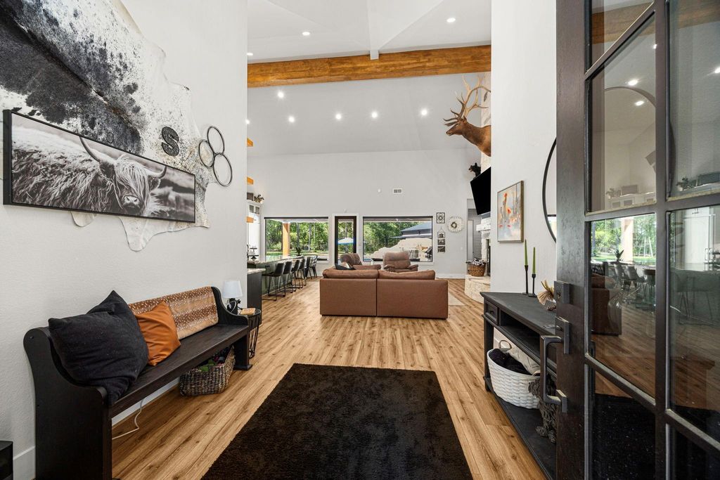 This 1.5 story picture-perfect home is framed by trees for added privacy, features an oversized 2-car garage plus a 38’ x 50’ AC ready shop with car lift. Soaring ceilings and stunning wood beams create a warm, inviting living space. The gourmet chef’s kitchen offers a large island, double ovens, granite counters, under-cabinet lighting, and a pot filler. The living area features a striking stone fireplace and views of the resort-style backyard. The luxurious primary suite includes a spa-inspired ensuite with separate soaking tub, elegant shower, dual sinks, and two closets. You'll find three additional bedrooms as well as two full bathrooms, and a powder room with outdoor access for pool guest. Plus a game room {flex space} upstairs! Outdoor living with a covered patio, kitchen, gas firepit seating, and a resort-style heated pool and spa with sun shelf, slide, and grotto. Lights under the eaves for holiday fun! Experience privacy, luxury, and functionality in this stunning home!