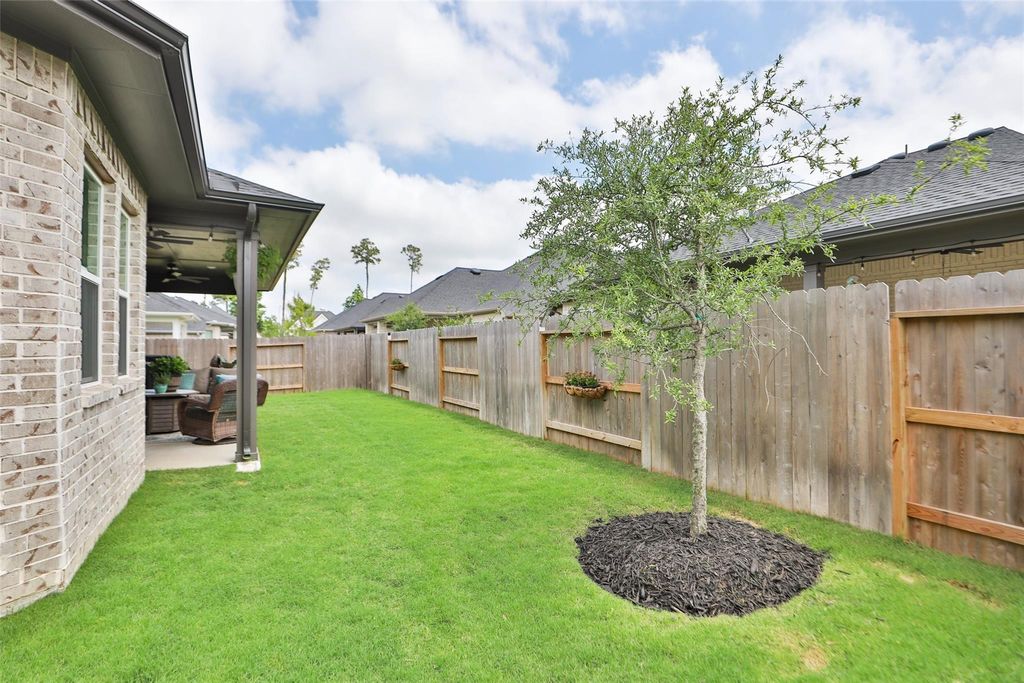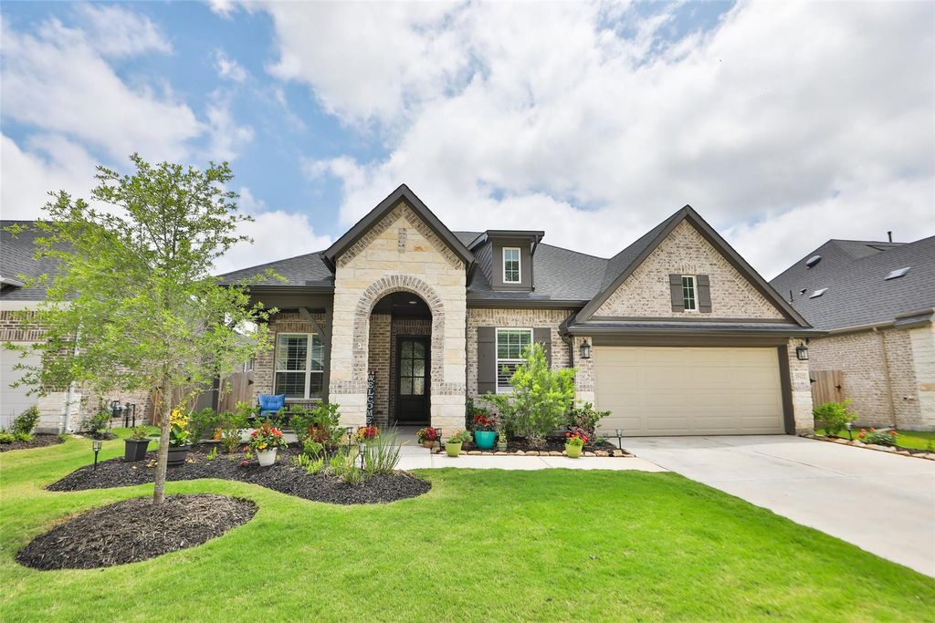 Stunning and barely lived in! Expansive welcoming front porch leads you into this charming 3 bedroom, 2 bath home with a half bath. Light and bright color scheme! High ceilings and large windows with plantation shutters throughout the home! Popular and easy maintenance vinyl plank floors in the main areas of the home. You will love the huge kitchen island for friends and family to gather! Oversized dining! Large living area wired for sound! Don't forget the covered generous sized patio with speakers to entertain here as well! Primary bedroom with bay windows and gorgeous primary bath with walk in shower that offers bench and rain showerhead. Also a massive closet! Study is at the entrance and offers doors for privacy. The oversized laundry room with folding table and spacious guest bedrooms and secondary bath are at the front of the home, separate of the primary bedroom. Garage has 9x20 storage area and with newly installed epoxy coating! Just three minutes to downtown Tomball!
