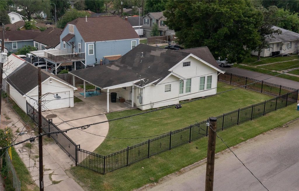 Freshly refurbished 1.5-story home on an oversized 6,200 sq ft corner lot featuring refreshed wood floors, fresh interior paint, updated kitchen and bath countertops, and new ceiling fans throughout. The main level offers 2 bedrooms down, including a primary with en-suite bath, a combined living and dining area, and a galley-style kitchen with a defined entry for added separation. A rare split upper-level loft/flex space provides two distinct areas ideal for office, media, hobby, or workspace use. Exterior features include a covered front porch, covered rear patio, detached garage, and utility room located within the garage. Centrally positioned near parks and Downtown Houston with convenient connectivity to I-45, I-10, Loop 610, and Hwy 225, making commuting throughout Houston quick and convenient.