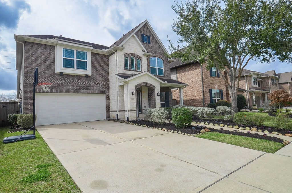 This stunning residence offers 4 bedrooms, a private study, and 3.5 baths, blending style, comfort, and functionality. A charming foyer welcomes you into a dramatic interior highlighted by a spacious study—perfect for remote work. The open-concept layout is ideal for entertaining, featuring tile floors, soaring ceilings, and abundant natural light. The heart of the home includes an open kitchen–family room with 18' ceilings & a gourmet island, complemented by custom cabinetry, quartz countertops, and stainless-steel appliances. The primary suite provides a serene retreat with a soaking tub, walk-in shower, and dual vanities. Upstairs, enjoy a generous game room and spacious secondary bedrooms with laminate flooring. Walking distance to Sawmill Lake Club, resort pools, trails, fitness center, water parks, Golf Club +Grille, 100+ acres of parks. Top Ft. Bend schools and not affected by the new school zoning, with quick access highway 6 Ft.Bend Toll Rd &59. No back neighbors. A must see!