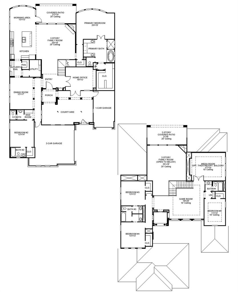 Private courtyard. Two-story family room with a wood mantel fireplace and sliding glass doors. Home office with French doors. Kitchen features an island with built-in seating space, a 6-burner gas range top, a spice cabinet, a walk-in pantry and a Butler's pantry. Private primary suite features a curved wall of windows and opens to the patio. Primary bath includes double doors, separate glass-enclosed shower, a freestanding tub, dual vanities, a linen closet and a large walk-in closet. Guest suite with full bath and walk-in closet located on the first floor. Upstairs game room and adjacent theatre room. Secondary bedrooms, a Hollywood bath and linen closets complete this generous design. Mud room. Two-story covered backyard patio. Three-car split garage.