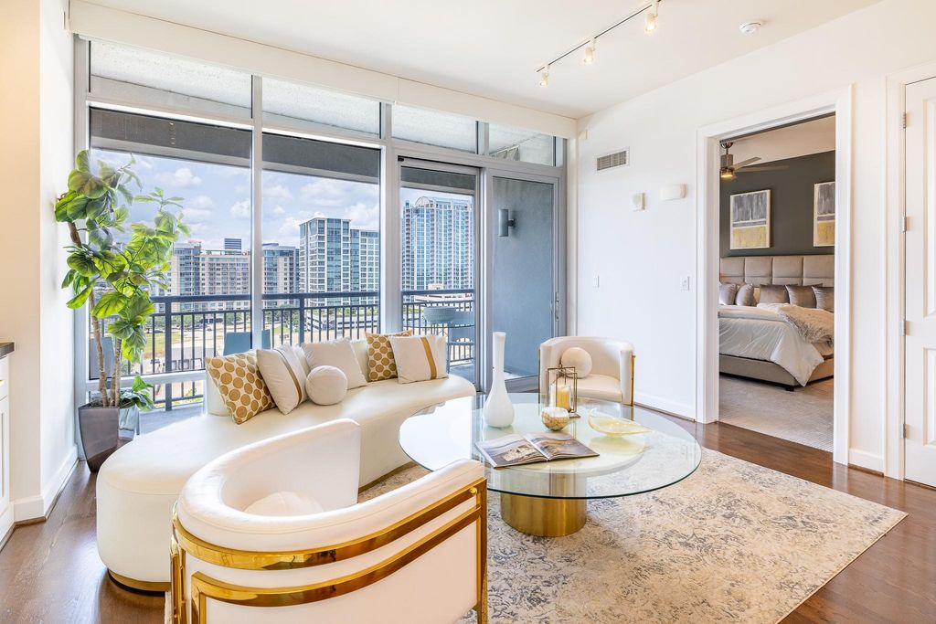 Spectacular in every way, this light-filled 1/1.5 on the 10th floor impresses from the front door balcony with panoramic Galleria and Westcreek views. Shows beautifully. Unit 1003 includes 2 parking spaces, all appliances, custom lighting, plus a 65” mounted TV and Bose sound bar. Features include electric living room shades, custom closet built-ins, upgraded bedroom carpet, and finishes beyond the developer’s standard. Highland Tower is a renowned 17-story full-service building perfectly situated near River Oaks District and Highland Village in a walkable setting. Schedule your private tour and see why you’ll love living here!