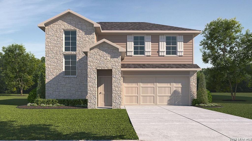 Designed for comfort, flexibility and fun, The Kendall floor plan at Brookstone Creek in San Antonio, TX offers a spacious 2161 square feet of thoughtfully arranged living space across two stories. With 4 bedrooms, 2.5 baths and a game room, this layout is ideal for growing families or those who love to entertain. Inside the home, an open-concept kitchen, dining and living area keeps everyone connected. The kitchen is a standout with stainless steel appliances, a gas cooking range, quartz or granite countertops, a farmhouse-style sink, flat panel cabinetry and a classic white subway tile backsplash. A spacious kitchen island adds extra prep space and casual seating. The primary suite is conveniently located on the main level, providing a private retreat complete with a walk-in shower, dual vanity sinks, and a large walk-in closet. Upstairs, all secondary bedrooms are tucked away for quiet living and feature carpet flooring, large windows, and ample closets. A versatile