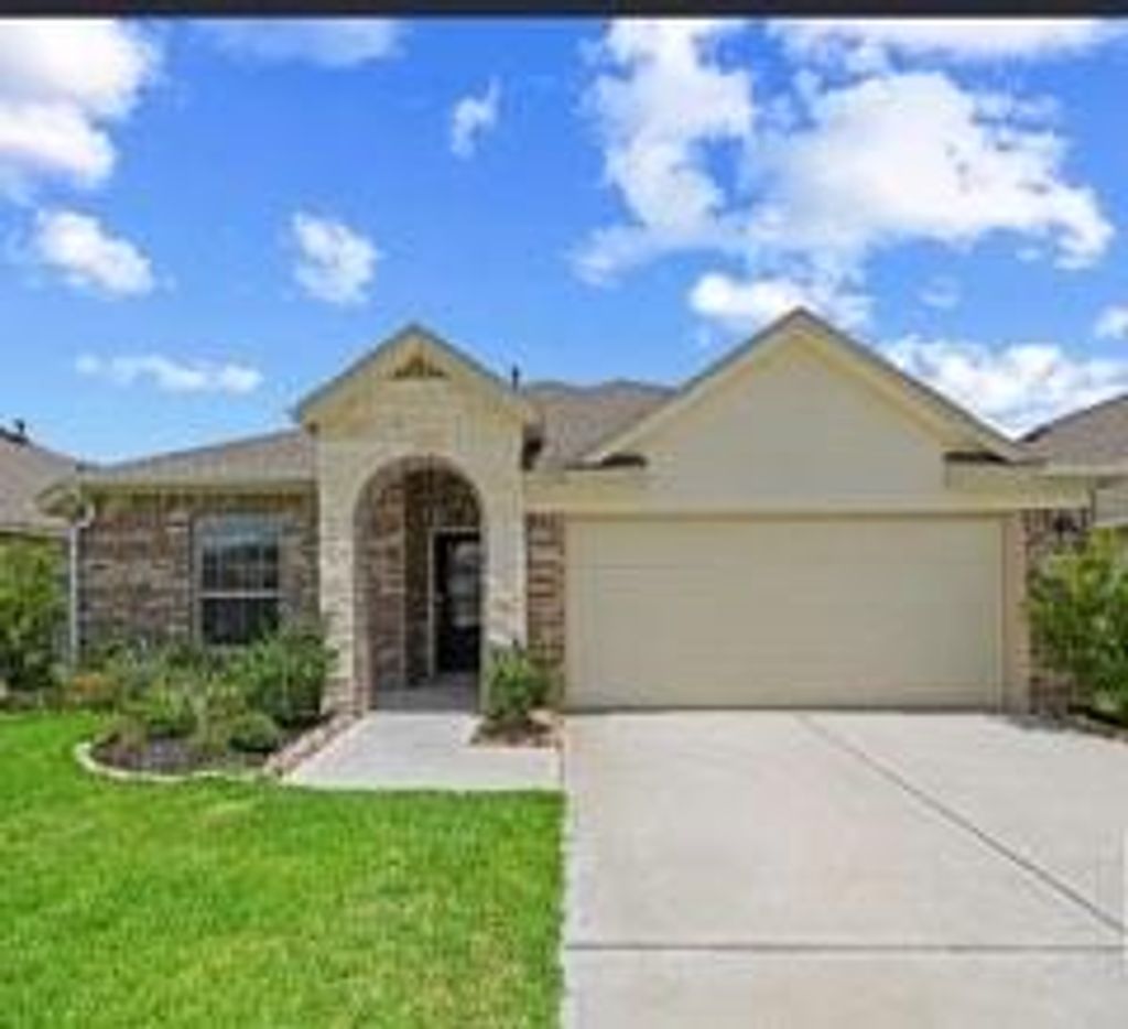 This gorgeous single-story home is now available for rent and can be your home ! I has an excellent brick/stone curb appeal, shaded front porch, and open floorplan! This newer build offers wood vinyl plank flooring throughout, neutral paint, recessed lighting, a French door study, ample natural light in the living/dining area, utility room, and kitchen featuring a breakfast bar island, quartz countertops, and stainless steel appliances. The primary suite has a walk-in closet while the secondary bedrooms share the 2nd full bath with dual vanities. Enjoy the manageable backyard space with a covered patio! Conveniently located with easy access to TX-242, I-69, TX-99, and Grand Texas with proximity to Bush Airport and The Woodlands!