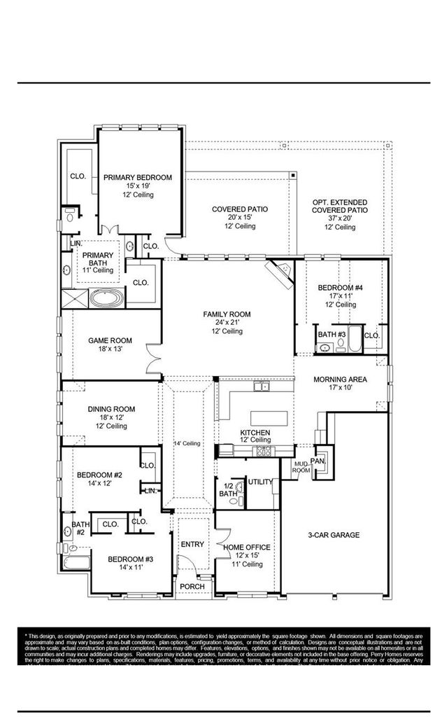 Home office with French doors set at entry. Extended entry leads past formal dining room to open family room with corner fireplace. Open kitchen features center island and walk-in pantry. Guest suite with private bath off morning area. Primary suite includes bedroom with wall of windows. Dual vanities, a garden tub, separate glass-enclosed shower and two walk-in closets in primary bath. High ceilings and walls of large windows add to this spacious four-bedroom design. Covered backyard patio. Mud room off three-car garage.