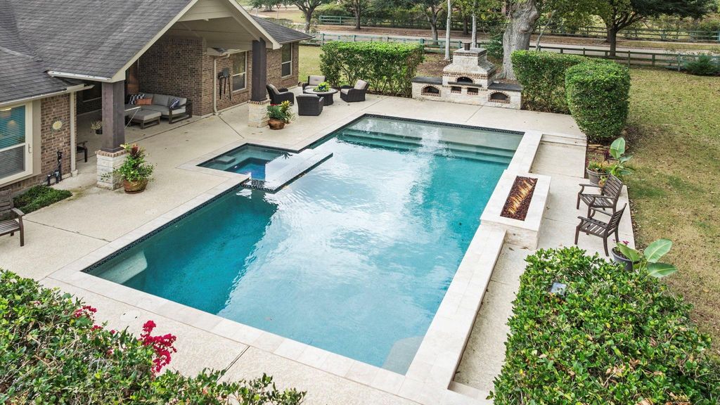 LOCATION, LOCATION, LOCATION! This gorgeous custom 1-story Coventry home is on a wooded HALF-ACRE LOT with NO SIDE OR BACK NEIGHBORS! This backyard is a showstopper! Vaulted covered patio provides perfect views of nature, a sparkling pool and spa, gas fire pit, and a real wood burning brick oven! Hop on a trail right outside the back fence for a walk through nature. In the front, stone & brick elevation, with a Texas style front porch & swing for a peaceful spot to unwind. Extra wide driveway and 3-car garage! Inside, the 3,554 sqft custom living space features hardwood floors, crown molding, coffered ceilings, beams, and an open living area with soaring ceilings. The large gourmet kitchen features ss appliances, granite countertops, and double islands w/ breakfast bar, perfect for entertaining. All 4 bedrooms have a full ensuite bath! Enjoy a private home office, wine grotto, formal dining room, living room w/ fireplace, breakfast room, and dedicated media room waiting for popcorn!