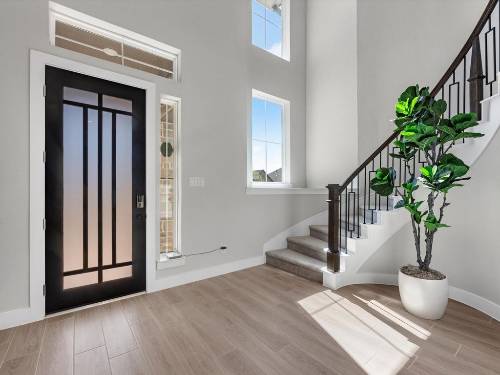 The Goldeneye - Fantastic, two-story plan with 4 bedrooms, 3 baths, and 2 car garage. This home features 8-foot exterior and interior doors, double-height ceilings, a grand entry with a curved staircase, an open-concept layout with an upstairs game room overlooking the great room, a large central island facing the great room, large upstairs walk-in attic perfect for storage, and a covered outdoor living area. A thoughtful design: two bedrooms with two baths downstairs, two bedrooms upstairs with a shared bath featuring double sinks. Options: electric fireplace, built-in kitchen appliances, glass sliders at great room, extended covered patio, office from flex, second-floor open railing, bed 5/4 bath, media room, shower only at bath 2, luxury primary shower, primary bath free-standing tub, 5' garage extension, 1-bay garage extension.