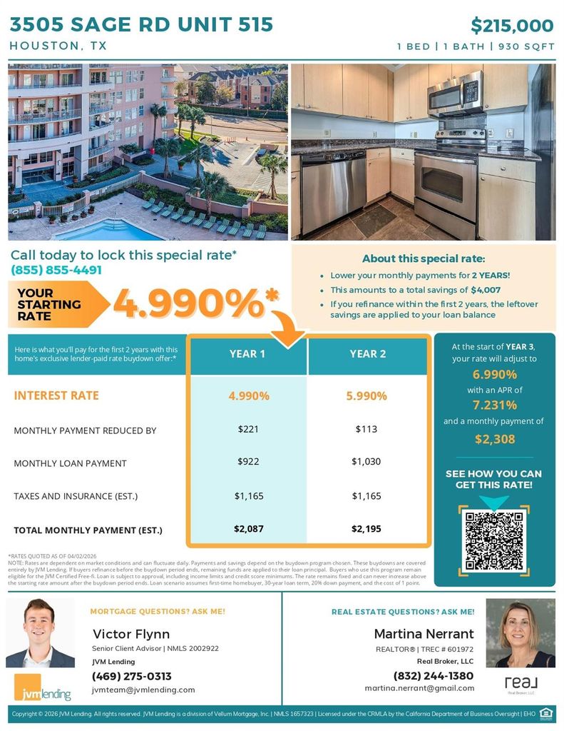 3505 Sage Rd unit515 is listed for sale at $ 199,000. The Mid/Hi-Rise Condo property has 1 bedroom, 1 Full Bathroom, 930 square feet and was built in 2000. Enjoy luxury mid-rise living in highly desirable top-floor 1BR, 1-bath duplex at The Mark. This completely updated Unit offers rare advantage of no upstairs neighbors and exceptional natural light .The gourmet kitchen features granite countertops, a kitchen island, and a built-in beverage.The open-concept living area flows seamlessly to one of 2 private balconies,Both balconies overlook the pool, offer panoramic, unobstructed views.The downstairs BR includes a full bathroom and an oversized walk-in closet. Additional highlights include a full-size washer and dryer and an excellent floor plan designed for comfort and functionality.Residents enjoy a truly maintenance-free lifestyle with 24h concierge, a business center, resort-style pool, fitness center, sauna. The unit includes an assigned parking space, ample visitor parking.Ideally located in the heart of the Galleria, just steps from premier shopping, fine dining,Galleria Mall, convenient access to Downtown,Texas Medical Center.