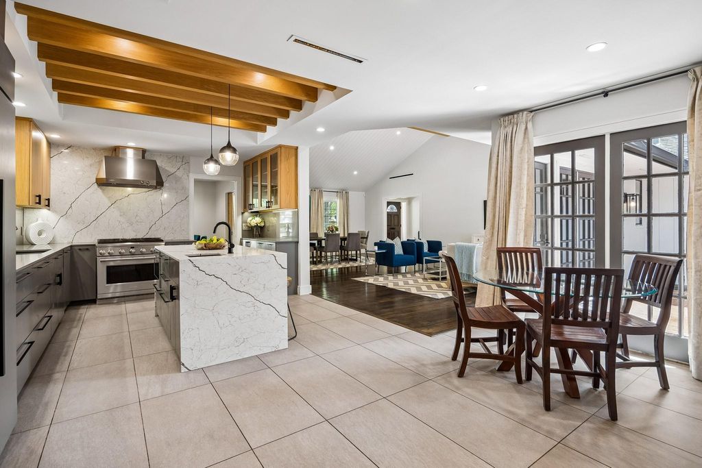 Reimagined & majority taken to studs & expanded by architect-owner (2020–2021). 4 beds, 3 baths, dual primary bedrooms & study blends timeless character w/high-end modern updates on approx 1/3 acre, tree-filled lot. 2020 Major improvements include roof, electrical panel, plugs, switches, copper wiring, underground drain lines, ductwork, blown cellulose insulation, low VOC paint & HVAC. New Chef’s kitchen w/GE Monogram appliances, custom white oak & maple cabinetry w/soft-close, quartz waterfall island, 6-burner gas range, panel-ready refrig/freezer & 1200 CFM venthood. Raised ceilings w/wood beams in living & kitchen & transom windows in addition invite natural light. Double-pane windows along front, sides & in addition enhance efficiency. Gated drive, circle drive (2022), sport court & wood & large format tile floor. No carpet. Designer M&M Lighting. Private addition offers separate entrance & parking, ideal for 2nd primary/guest suite/multigenerational living & easy future expansion.