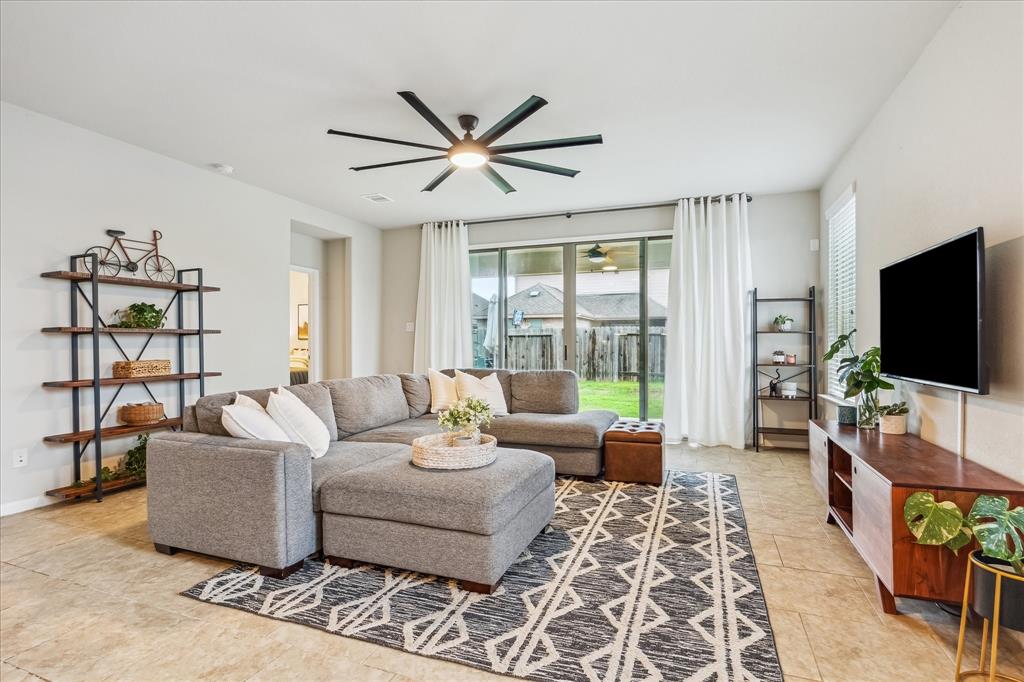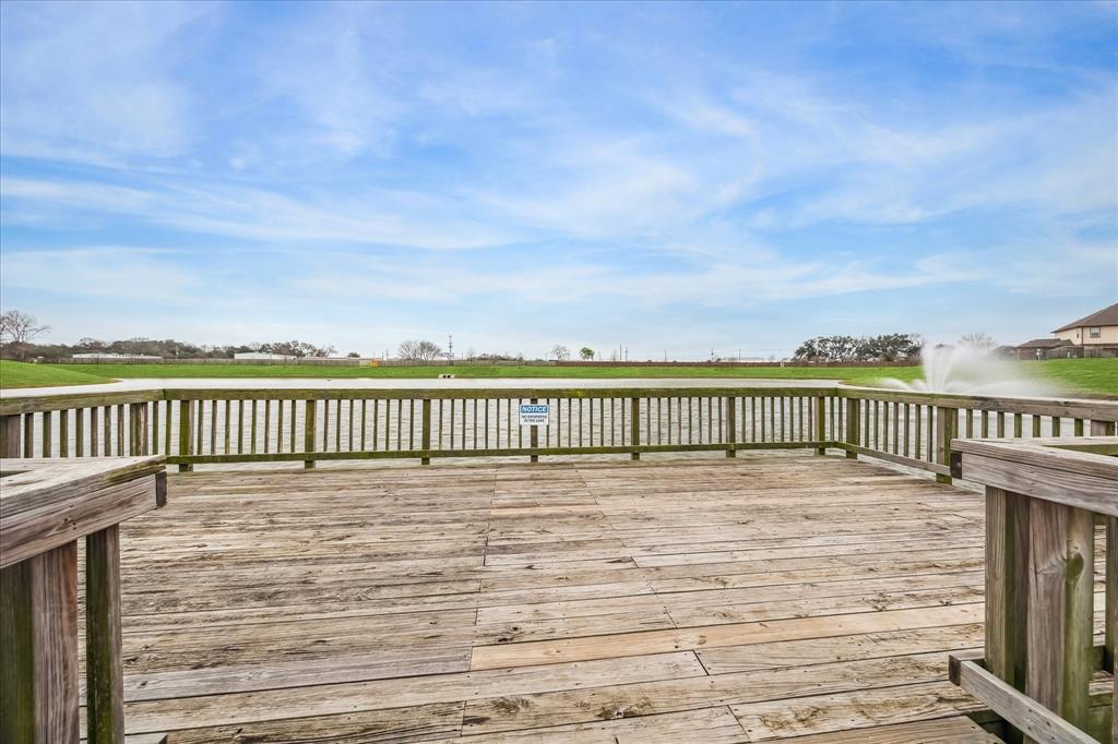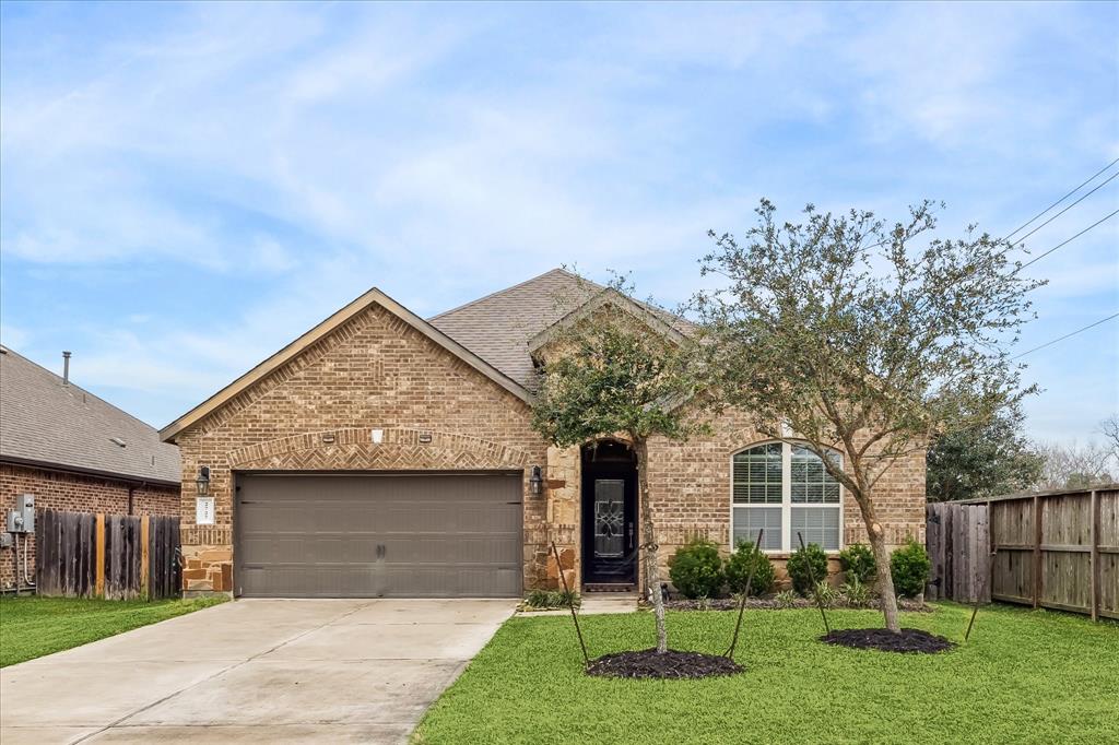 Welcome to spacious one-story in Bakers Landing. This charming home is located on a desirable corner adjacent to the neighborhood park, walking trails, lake and fishing pier offering privacy and scenic views. Upon entry you are greeted with soaring ceilings and view of the elegant dining room. A secondary bedroom and full bath at the front of the house. The open kitchen and living room are perfect for entertaining and overlook the backyard with glass doors that lead to the large covered patio. The kitchen boast a large island with breakfast bar and plenty of storage. The primary suite features tall ceilings and an en suite with a separate soaking tub and shower for a spa-like retreat. The two additional bedrooms share a third bath. The home is walking distance to coffee and grocery stores. The location offers easy access to Houston and has plenty of shopping and restaurants nearby. Perfect for anyone looking for a move-in ready home in a friendly and quiet neighborhood.