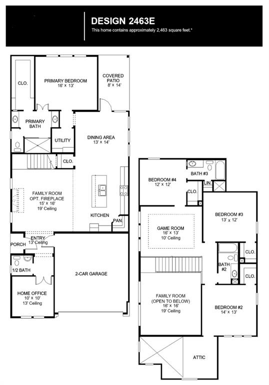 Enter through the side porch into a split entryway, where a private home office awaits behind French doors on one side, while the family room beckons with its impressive 19-foot ceiling on the other. The kitchen features an island with built-in seating and a corner walk-in pantry, a 5-burner gas cooktop, seamlessly connecting to the adjacent dining area which boasts a wall of windows, offering ample natural light. Tucked away off the main living areas, the utility room adds convenience to daily tasks. The primary bedroom is a serene retreat, featuring a wall of windows for abundant natural light. French doors lead to the primary bathroom, complete with dual vanities, a glass-enclosed shower, and a spacious walk-in closet. Upstairs, discover a versatile game room with its own wall of windows. A private guest suite awaits, offering comfort and privacy with a full bathroom, walk-in closet, and linen closet. Additional secondary bedrooms, each with walk-in closets, share a well-appointed bathroom and offer attic access for storage convenience. Covered backyard patio. The two-car garage is accessible from the main entryway.