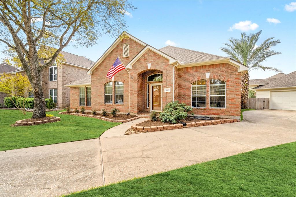 4505 Spring Iris Court is a three-bedroom, two-bathroom, one-story home with an office, game room, and three-car garage on a cul-de-sac lot in League City, Texas. The home features an open floor plan with engineered hardwood floors, abundant natural light, and a double-sided gas log fireplace connecting the main living areas. The kitchen offers GE stainless steel oven and microwave, a Bosch gas range, generous cabinet space, and opens to the breakfast area and living room. The living room features high ceilings and engineered wood floors. The guest bedrooms are separated by a game room, providing additional living or entertainment space. The spacious primary suite includes an ensuite bathroom with spa tub, separate shower, double-sink vanity, and his-and-hers walk-in closets. Villages of Oak Creek Colony is located across from Creekside Intermediate & Clear Falls High School, offering walking trails and a community pool. Per the seller, roof was replaced 11/2023.