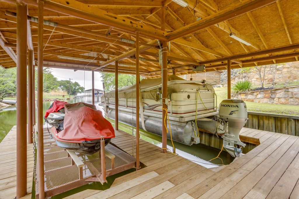 Set on a quiet, private stretch of waterfront on the Fort Worth side of Lake Granbury, this rare custom home offers the ideal balance of seclusion, accessibility, and a beautiful view of the lake. Positioned in a protected cove with a clear sightline to the main body of water, the property delivers both calm shoreline living and scenic water vistas. Built in 2012 by Couto Homes, this fully custom 4-bedroom, 3-bath home was thoughtfully designed with oversized walkways and doorways to provide ease of movement and wheelchair accessibility throughout. The open-concept floor plan is anchored by expansive floor-to-ceiling windows that frame the lake, filling the home with natural light and uninterrupted views. The main living area features a gas fireplace and flows seamlessly into the kitchen and dining spaces, creating an ideal setup for both everyday living and entertaining. The primary suite is located on the main level and includes a private exterior door leading directly to the wraparound porch, perfect for quiet mornings or evening lake views. Outdoor living is a standout feature, with a wraparound porch spanning three sides of the home (excluding the garage side), offering multiple vantage points to enjoy the water and surrounding landscape. The 1.29-acre property consists of three parcels, with the main parcel currently benefiting from an agricultural exemption. Additional highlights include: Private well water; Lake-fed sump pump for the sprinkler system; Covered dock with space for a boat and jet skis; Extensive stone retaining walls that terrace beautifully down to the water’s edge. Located within a small, low-impact HOA community, this property offers a rare opportunity to own a private, well-built waterfront home with both functionality and timeless design. Schedule your private showing today to experience this exceptional lakefront property in person!