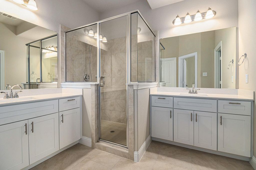 the master bedroom with an ensuite featuring dual vanities, separate toilet closet, walk-in shower, and a large walk-in