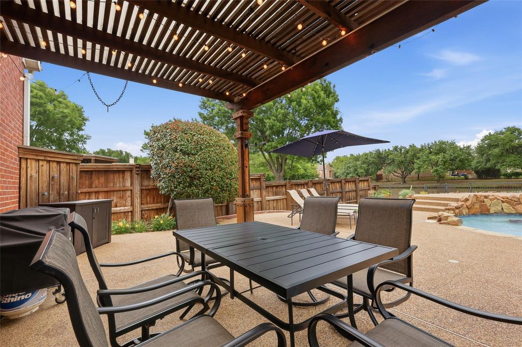 Over $135K in thoughtful upgrades elevate this beautifully refreshed Flower Mound home, complete with a rare 3-car garage and a private backyard retreat. Step outside to enjoy a sparkling private pool and spa, covered pergola, thoughtfully designed Texas native plants and the most tranquil pond and fountain views you'll find in DFW, an ideal setting for both entertaining and everyday relaxation. Don't overlook your private gate to the stocked fishing pond. The flexible layout features a primary suite and separate guest bedroom with full bath on the main level, offering comfort and privacy for visitors or multi-generational living. Upstairs includes a flex space that could be a loft or media room, plus generous storage throughout the home. Wide-plank white oak engineered flooring adds a clean, modern touch. The primary bath has been fully transformed with a spacious walk-in shower, slate tile flooring, quartzite surfaces, and high-end designer finishes. The guest bath downstairs has also been upgraded with an expanded frameless glass shower and matching quartzite counters. Additional improvements include a replaced pool heater, new Jandy pool control board that can be run by your phone, new downstairs HVAC system (2026), updated designer lighting, and so many more. Two large backyard sheds convey. On top of all of the amazing features of this home, you'll also find some of the best graded schools in DFW. This is not the house to sleep on. Trails, stocked fishing pond with fountain, private backyard oasis, featured lighting, and a beautifully updated home. This will not last long! Zillow tour should be available on Tuesday.
