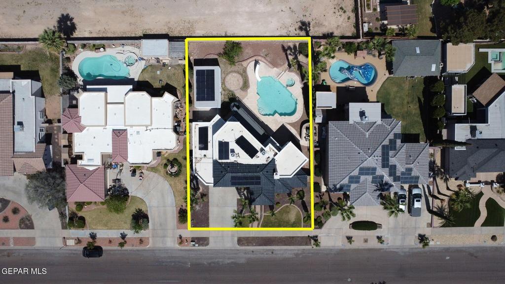 Situated In Upscale Los Paseos At Vista Hills In East El Paso, Custom-Built, Updated 2-story Home Offers Spacious Living W/Resort-Style Amenities. The upstairs master suite serves as a private retreat, featuring spa-like bath w/a clawfoot tub, separate shower, & private balcony w/spiral staircase leading to the backyard. The outdoor space is designed for relaxation & entertaining, complete w/heated pool, jacuzzi, water slide, & detached, generously sized pool house. Inside offers 4 bedrooms, 3 baths, & a dedicated office space. Enjoy both formal living & dining areas, cozy den featuring Kiva-style fireplace. 2 additional upstairs bedrooms share a Jack-&-Jill bathroom, while the downstairs 4th bedroom provides convenient access to a 3/4 guest bath w/direct pool access. Additional features include solar panels, water softener, laundry room w/utility sink, plantation shutters, & garage equipped w/mini-split unit. Ideally located within walking distance to schools & minutes to Loop 375, shopping, & dining.