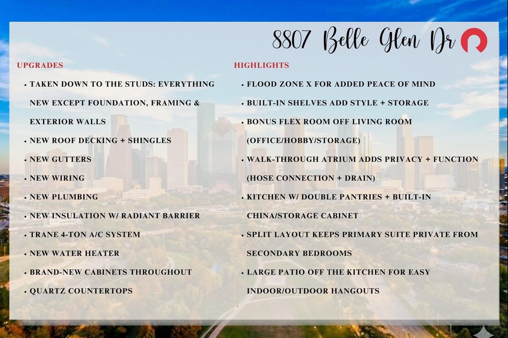 8807 Belle Glen Dr is listed for sale at $ 274,500. The Single-Family property has 3 bedrooms, 2 Full Bathrooms, 1951 square feet and was built in 1981. The lot size is 4500 Square feet. ##BR##Fully remodeled Kirkwood Country stunner zoned to Alief ISD and in Flood Zone X! Taken down to the studs: new roof decking + shingles, new gutters, new wiring + plumbing, new insulation w/ radiant barrier, Trane 4-ton A/C, and new water heater-everything is new except foundation, framing and exterior walls. Wide-open living/dining/kitchen features vaulted-ceiling living room w/ wood-burning fireplace + built-ins, plus a bonus flex room for office/hobby/storage. Walk-through atrium w/ hose connection + drain adds privacy (no front door facing the street). Bright kitchen offers quartz counters, soft-close cabinetry, built-in china/storage, and double pantries. Private primary suite includes separated toilet/bath area, dbl vanity, and dbl walk-through closets. Two roomy secondary bedrooms sit on the opposite wing w/ large windows + walk-in closets, near the hall bath + laundry. Large patio off the kitchen, plus a 2-car garage w/ raised slab on two sides, make entertaining easy.