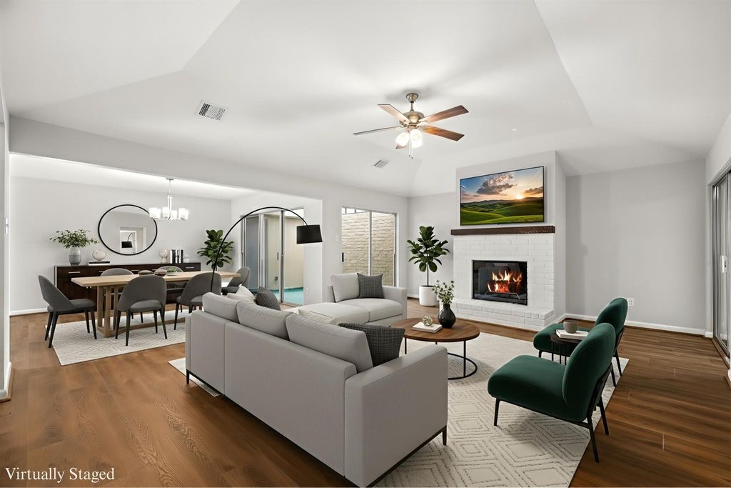 Fully remodeled Kirkwood Country stunner zoned to Alief ISD & in Flood Zone X! Taken down to the studs: new roof decking + shingles, new gutters, new wiring + plumbing, new insulation w/ radiant barrier, Trane 4-ton A/C, & new water heater-everything is new except foundation, framing & exterior walls. Wide-open living/dining/kitchen features vaulted-ceiling living room w/ wood-burning fireplace + built-ins, plus a bonus flex room for office/hobby/storage. Walk-through atrium w/ hose connection + drain adds privacy (no front door facing the street). Bright kitchen offers quartz counters, soft-close cabinetry, built-in china/storage, & double pantries. Private primary suite includes separated toilet/bath area, dbl vanity, & dbl walk-through closets. Two roomy secondary bedrooms sit on the opposite wing w/ large windows + walk-in closets, near the hall bath + laundry. Large patio off the kitchen, plus a 2-car garage w/ raised slab on two sides, make entertaining easy.